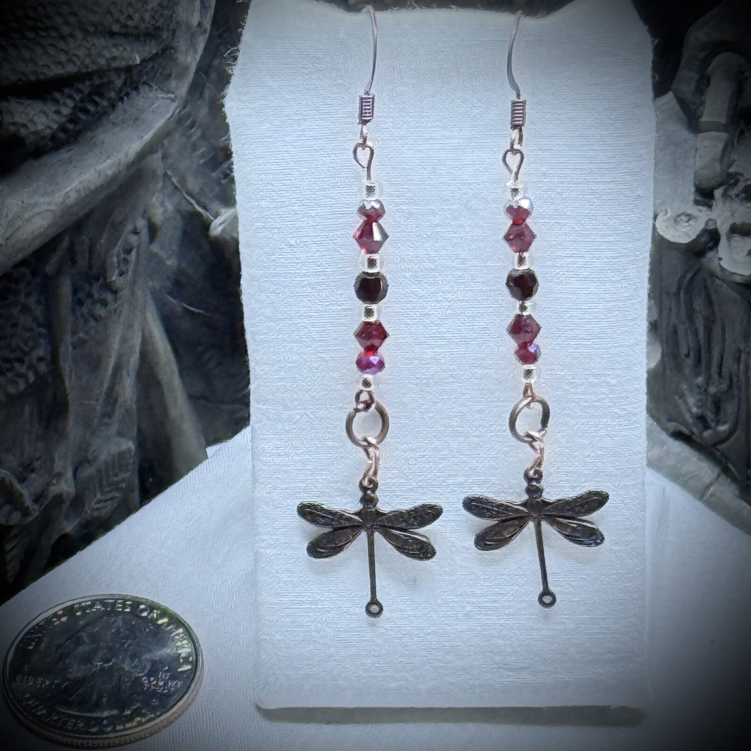 Embrace the enchanting allure of these red and copper dragonfly earrings, adorned with exquisite crimson Swarovski crystals and intricate glass beads. The vibrant colors and detailed design make these earrings a true statement piece for any outfit. Elevate your style with these unique earrings that beautifully blend elegance and whimsical charm!