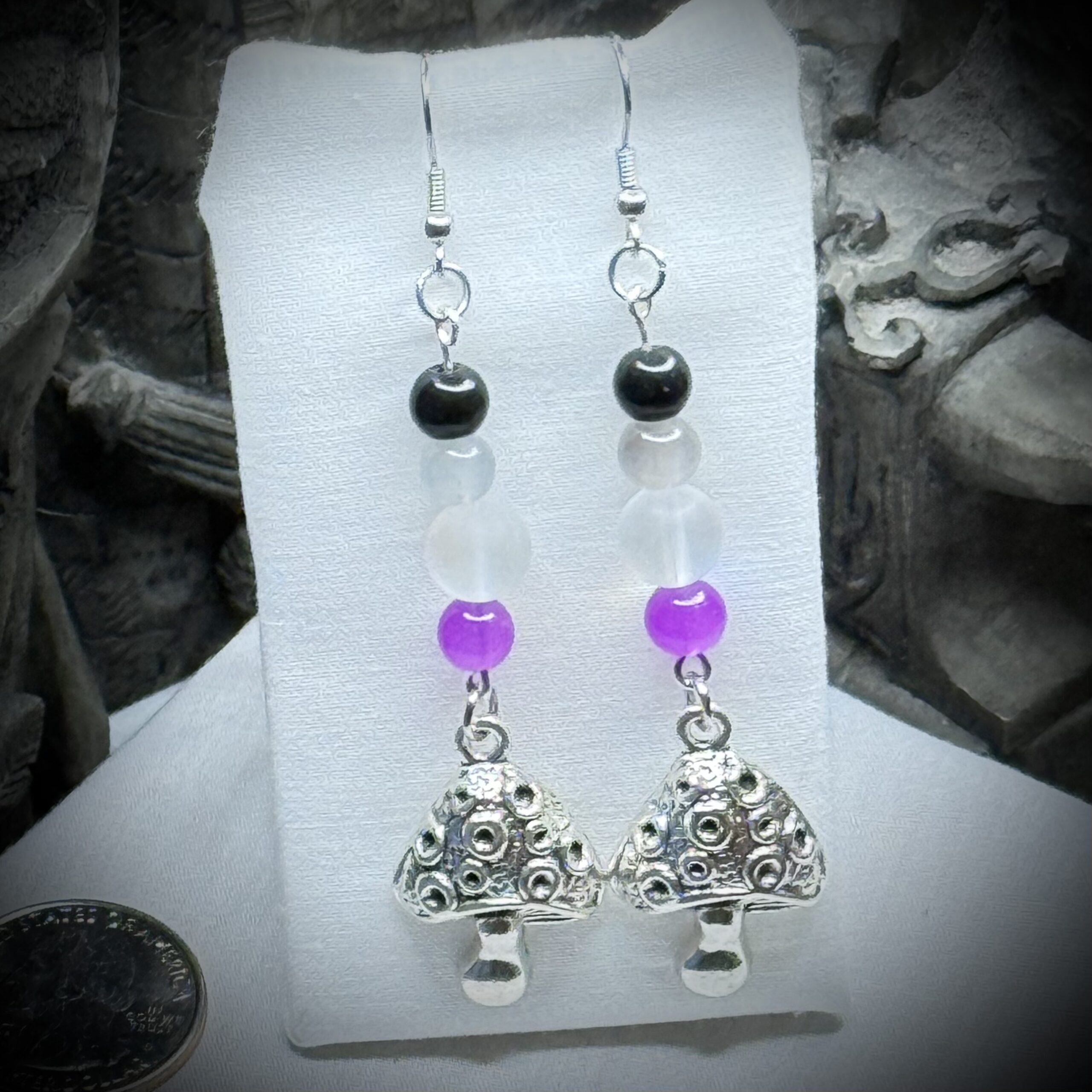 These ace/demi earrings are more than just accessories – they're a statement! The carefully selected glass beads in purple, white, grey, and black represent the strength and beauty of the ace/demi community. Playful charms add a touch of fun and personality. Wear them loud and proud!