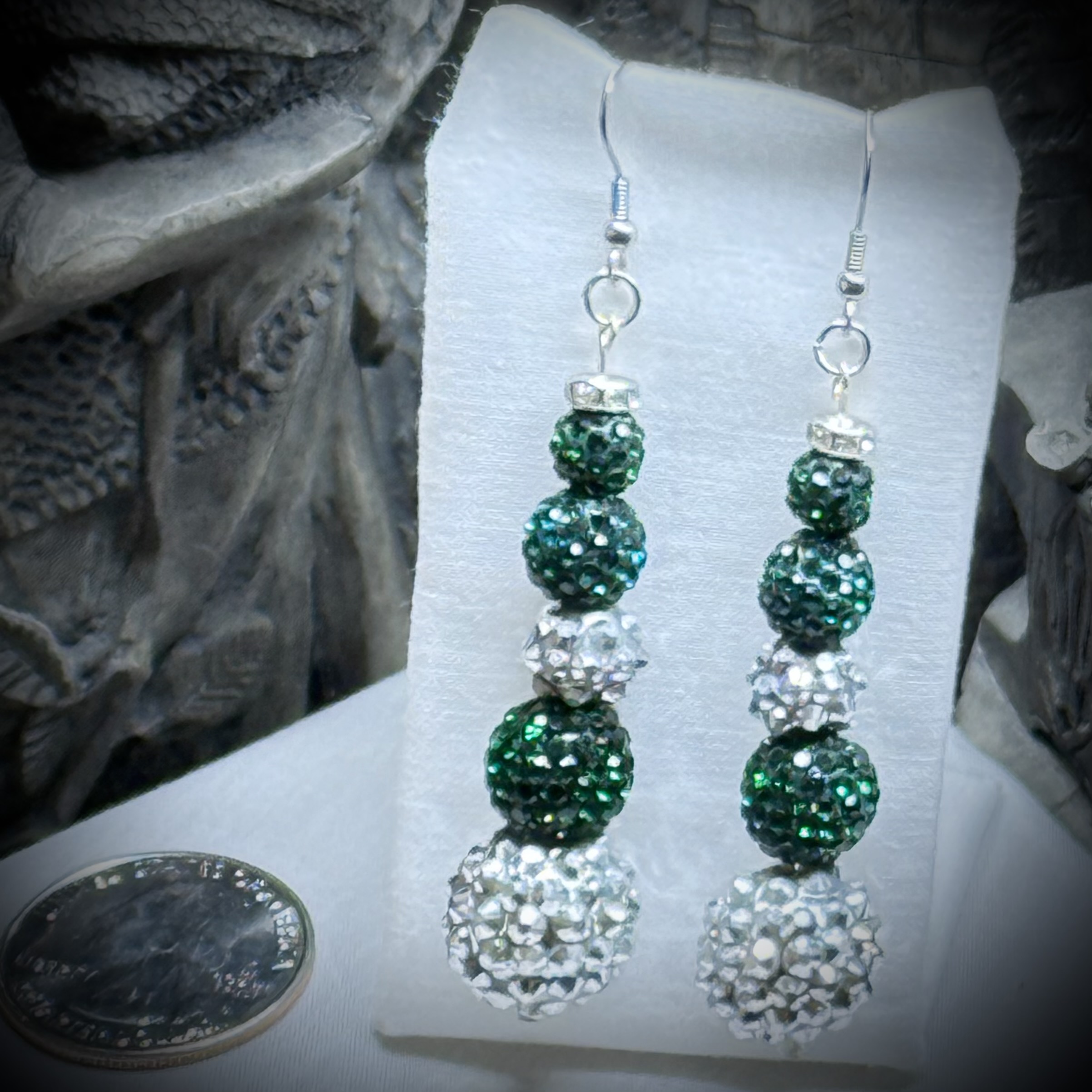 Unleash your inner diva with these breathtaking beaded earrings. The striking combination of cool silver and vibrant green, each bead meticulously adorned with sparkling studs, creates a mesmerizing texture and depth. Perfect for any queen who demands attention, these earrings are a statement piece that screams high-glamour and undeniable artistry.