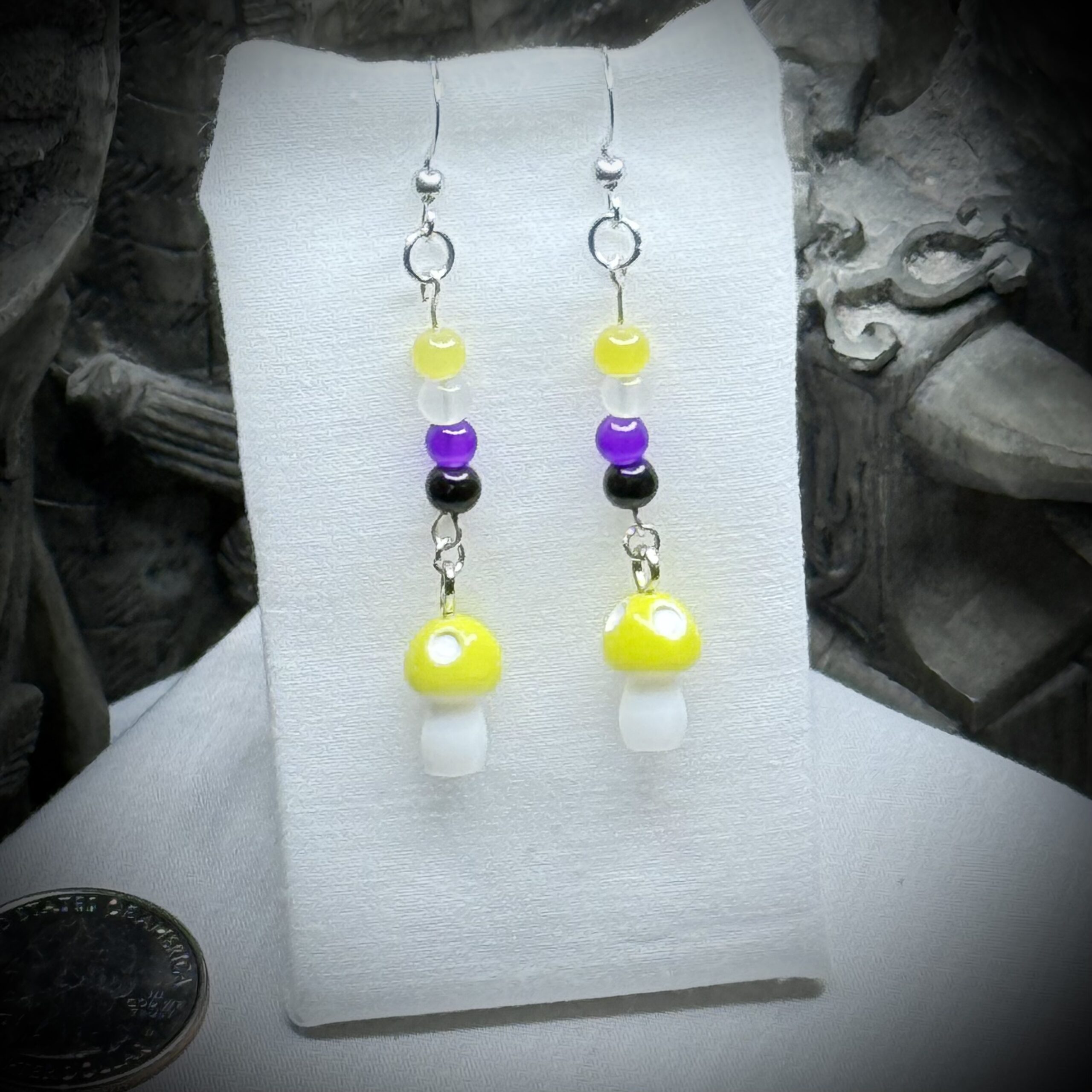 Declare your non-binary pride with these unique and expressive earrings. The combination of sleek black, vibrant yellow, calming white, and regal purple glass beads creates a stunning visual representation of the non-binary flag. The fun charms add a touch of personality, making these earrings the perfect accessory for any pride event or everyday celebration of your identity.