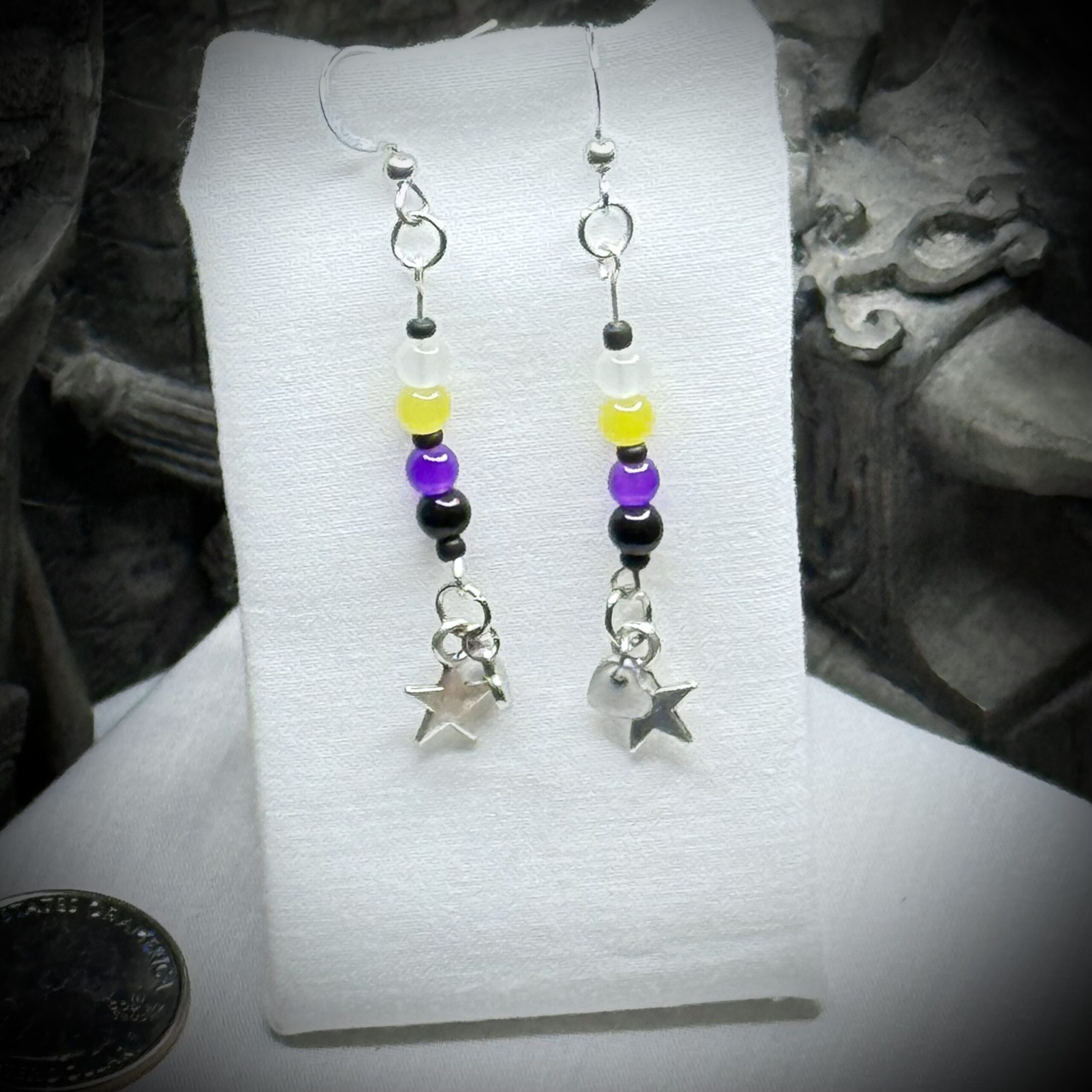 Declare your non-binary pride with these unique and expressive earrings. The combination of sleek black, vibrant yellow, calming white, and regal purple glass beads creates a stunning visual representation of the non-binary flag. The fun charms add a touch of personality, making these earrings the perfect accessory for any pride event or everyday celebration of your identity.