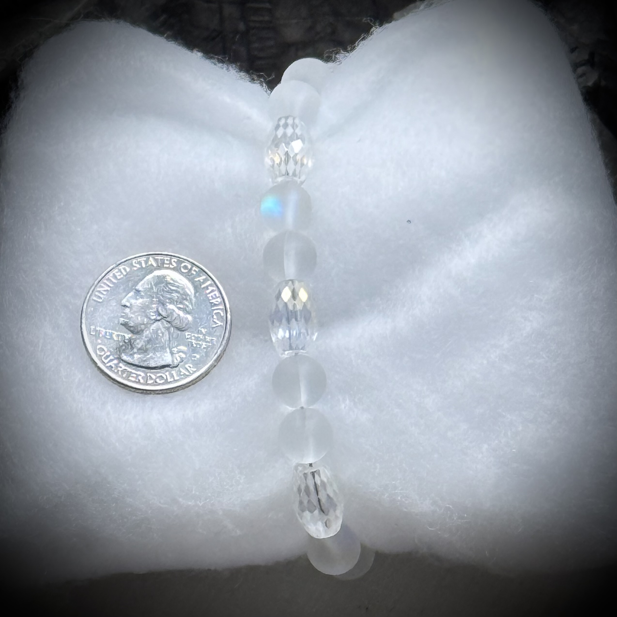 "Capture the ethereal beauty of starlight with the 'Celestial Shimmer' bracelet. This delicate piece features a harmonious blend of shimmering clear glass beads, reminiscent of crystalline ice, interspersed with mesmerizing aura glass beads. The aura glass, with its iridescent, shifting hues, evokes the captivating play of celestial light. Together, these beads create a bracelet that seems to hold the very essence of a starry night, offering a subtle yet enchanting sparkle that dances with every movement.