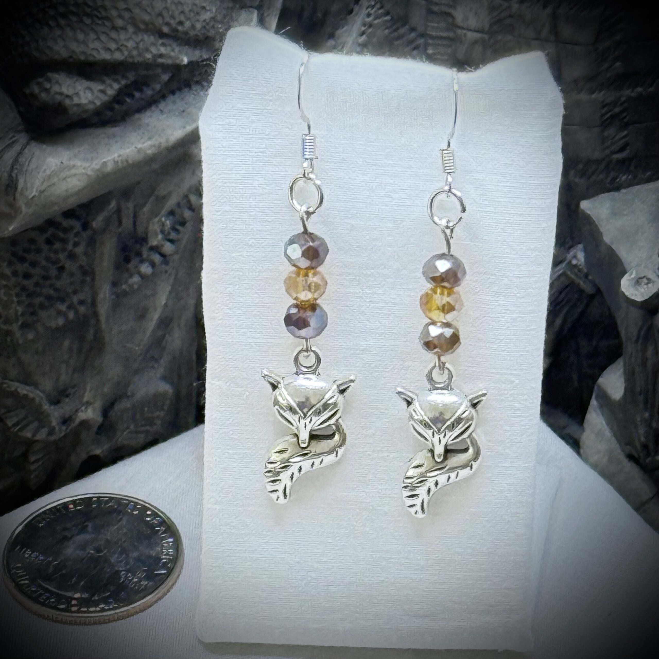Enchanting foxy friends meet rustic royalty in these delightful earrings. The Faerie Friends – Foxy – Rustic Royals earrings combine the charm of woodland creatures with a touch of regal elegance with crystal glass beads of brown and gold colors. A perfect blend of whimsy and sophistication.