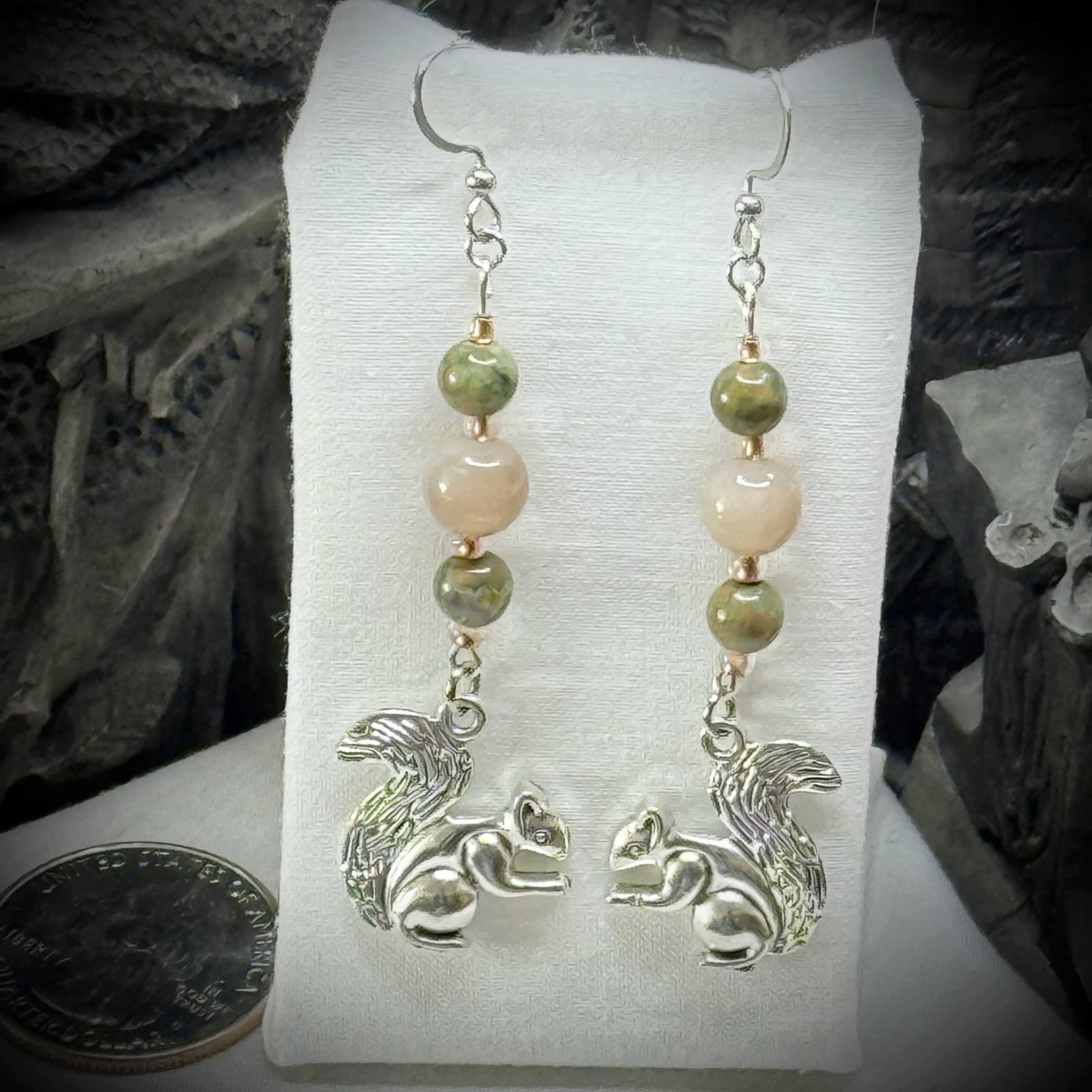 Indulge in the enchanting world of genuine gemstones with our Faerie Friends earrings featuring squirrels, Unikite, and Peach Moonstone. These natural gemstones are elegantly crafted into a whimsical design with a unique color combination that is sure to captivate all who see them. Elevate your style with these magical earrings and let your inner faerie shine!