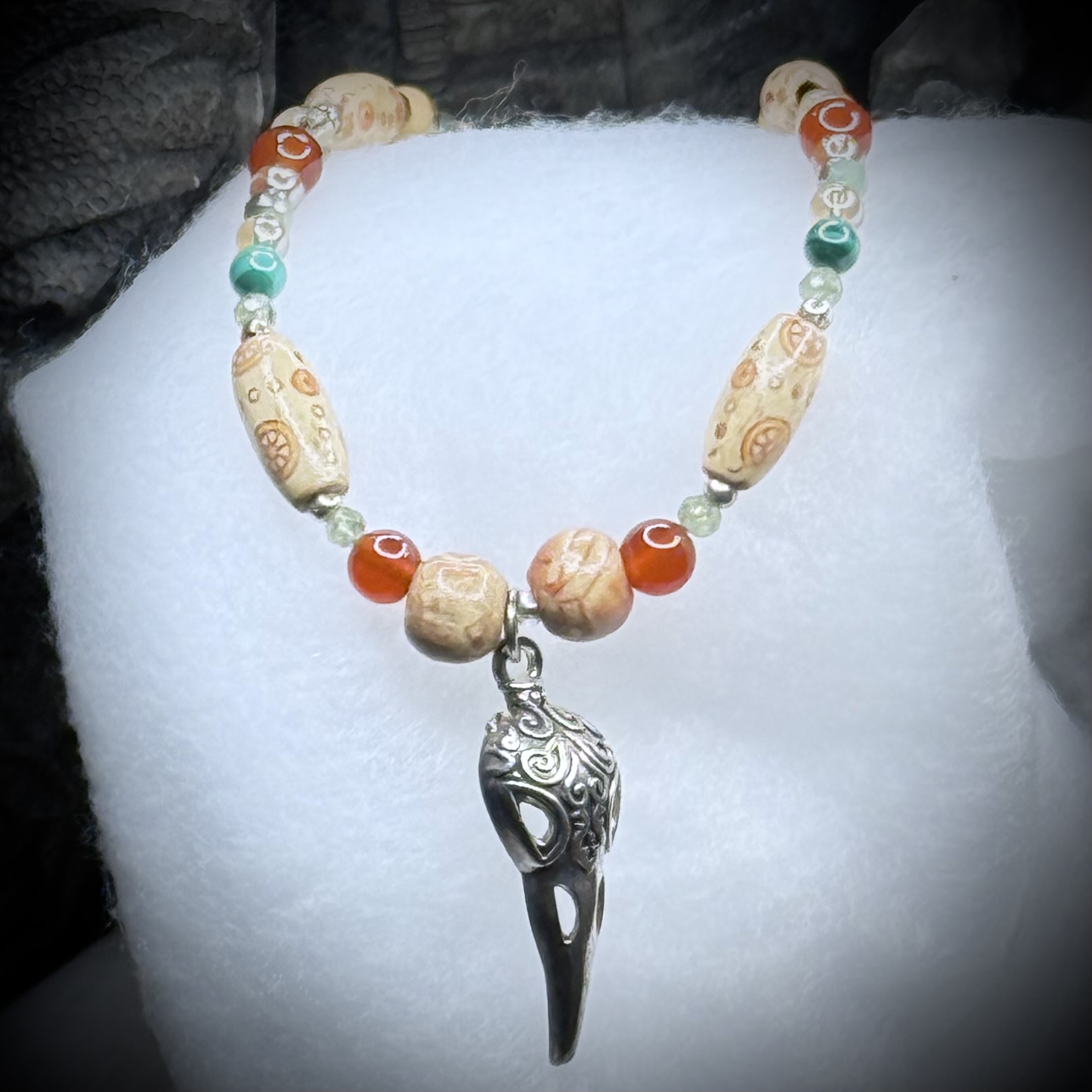 Awaken to the vibrant energy of 'Spring Raven,' a necklace that embodies the renewal of nature and the mystique of the raven. At its heart lies a meticulously etched metal raven skull, a symbol of wisdom and transformation. Surrounding this focal point is a rich tapestry of gemstones: the verdant hues of green tourmaline and malachite, representing growth and vitality; the fiery warmth of carnelian and citrine, igniting passion and creativity; and the subtle sparkle of Czech crystal, adding a touch of refined elegance. Interspersed are natural wood beads, grounding the piece in earthy connection. This harmonious blend of elements captures the spirit of spring's rebirth, guided by the enigmatic power of the raven.Findings and pendant are hypoallergenic and are without lead or nickel. 18" Long