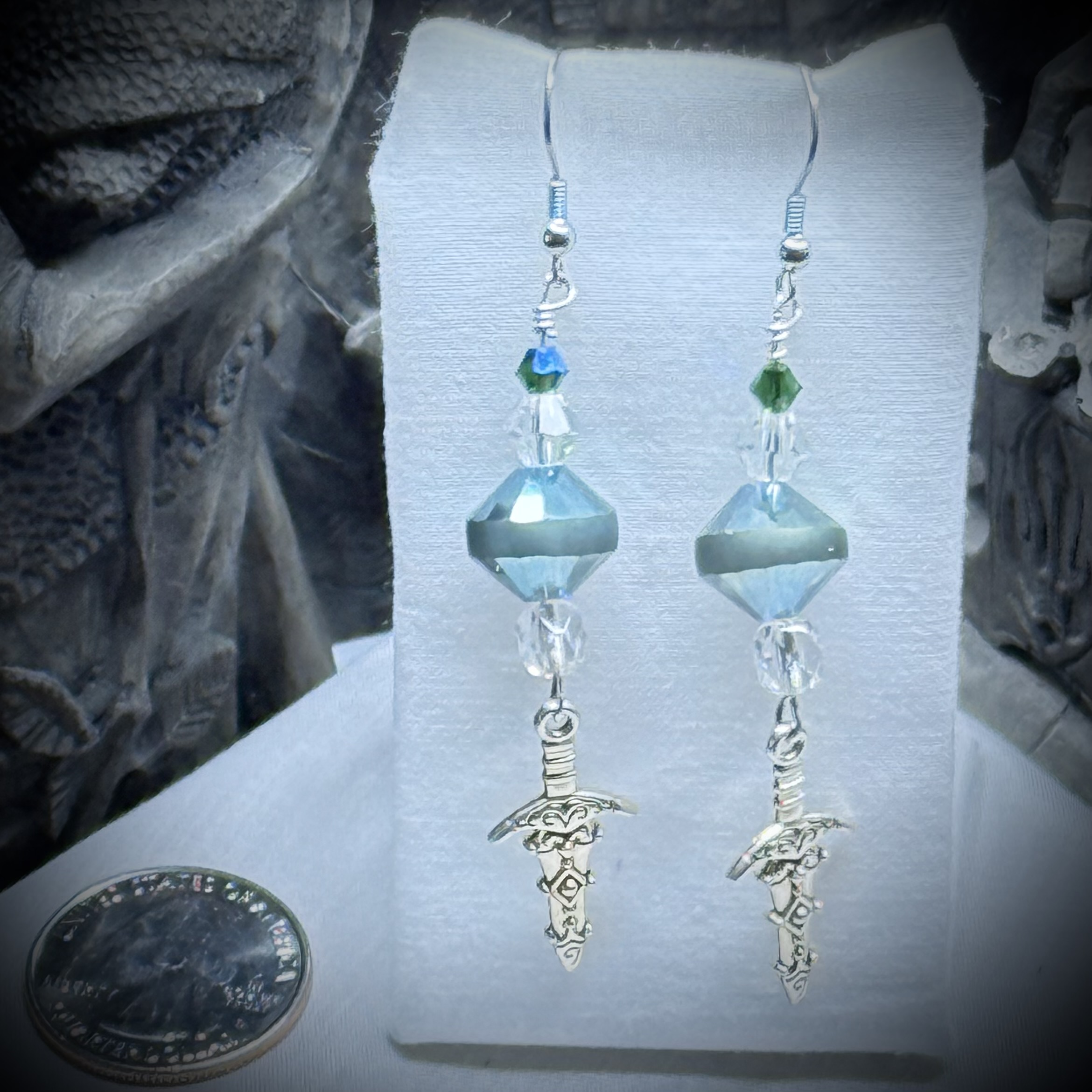 Invoke the magic within with these bewitching blade earrings, where delicate, shimmering green and clear beads cascade like captured starlight, leading to subtly sharpened blades that whisper of hidden power, cutting things away that no longer serve and untamed mystique, a touch of fantastical edge for the modern enchantress.