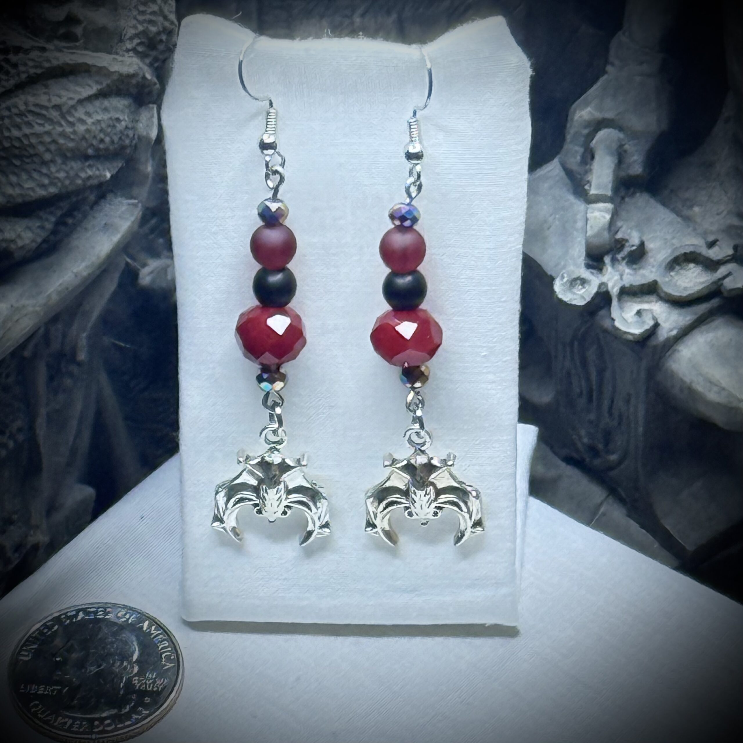 Glimmering in the dim light, these earrings are a symphony of dark elegance. Deep crimson beads, like drops of dragon's blood, intertwine with black glass spheres that seem to absorb the very light around them. From this captivating dance of color hang delicate silver bats, their wings outstretched as if in perpetual flight. These are no mere adornments, but conduits of ancient magic, whispering secrets of the night and bestowing upon the wearer a touch of the midnight magic. The earrings have Surgical Stainless Steel French hooks and clear silicon earring backs.