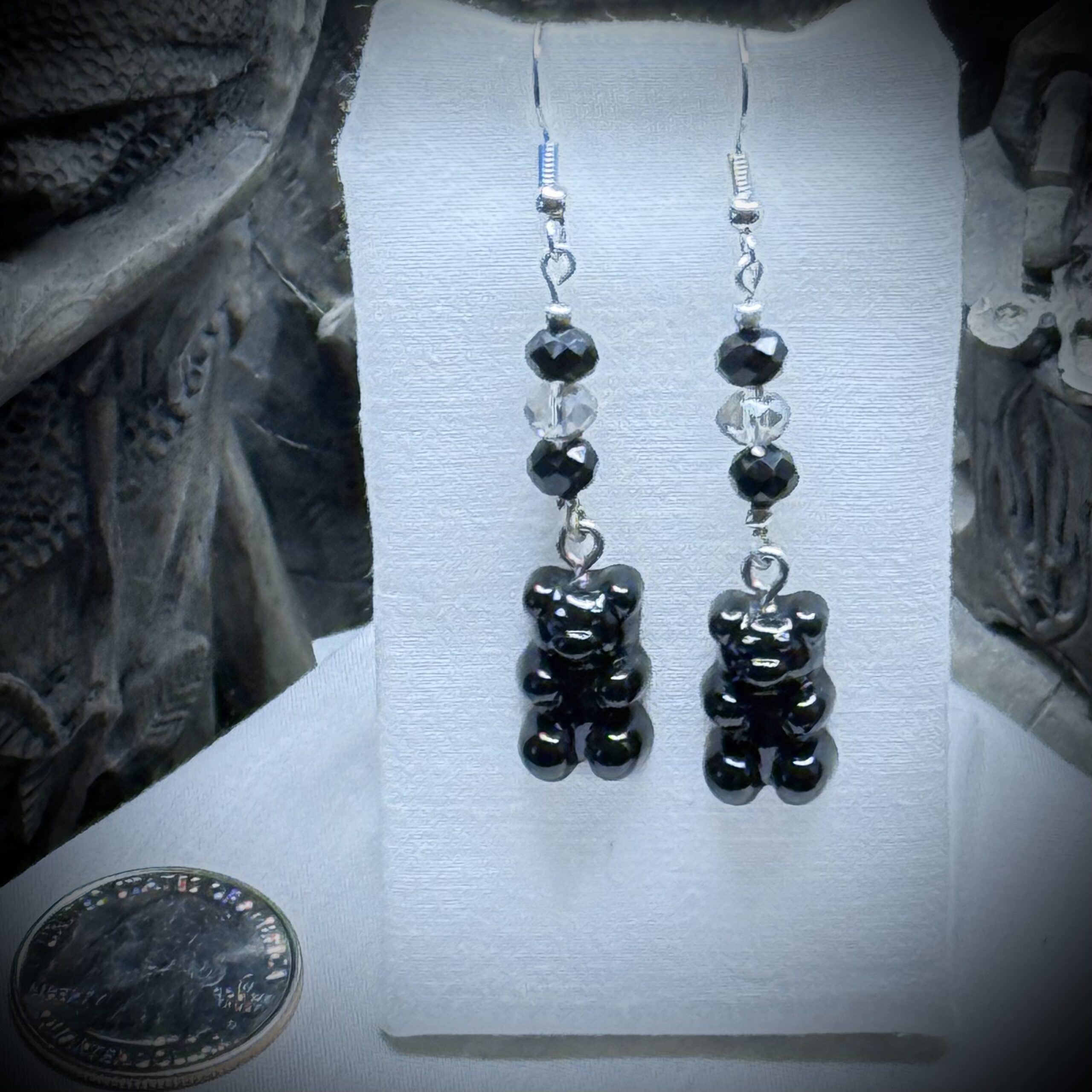 These earrings are a mischievous wink to your inner child, with a touch of gothic charm. The gummy bears, cast in a shadowy resin, look like they've been plucked from a moonlit candy forest. They're both playful and mysterious. Above them, black and clear colored glass beads dangle like star anise (which tastes of licorice flavors) chews, adding a touch of grown-up glamour to the whimsical bears.