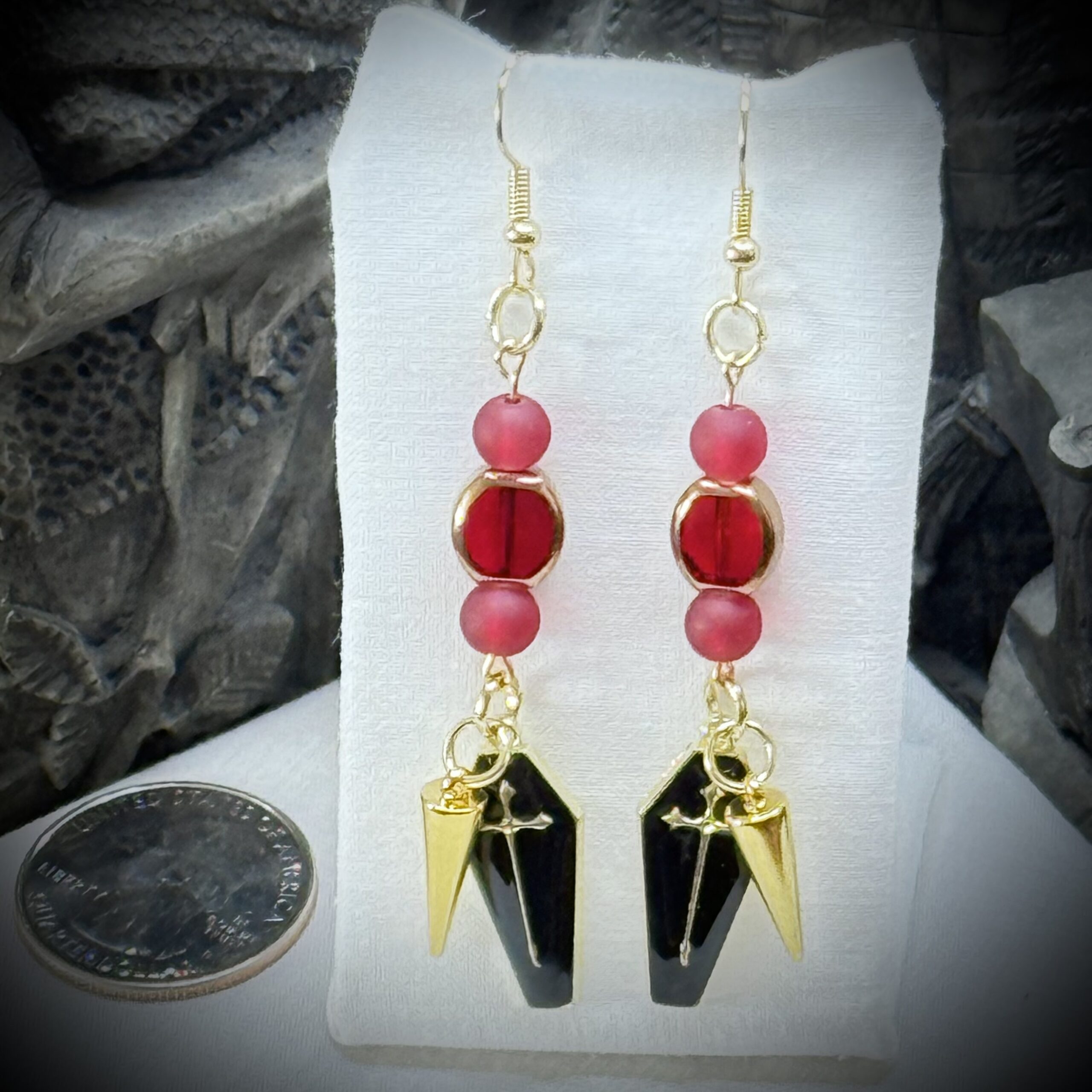 The gold pointy bits with black casket earrings are more than just accessories; they are a statement. A declaration of your love for the supernatural, your appreciation for the gothic aesthetic, and your connection to the timeless and powerful story of the the slayer, the allure of the vampire, and the magical inevetitable end. With red glass beads just add to reminder of the blood spilled.