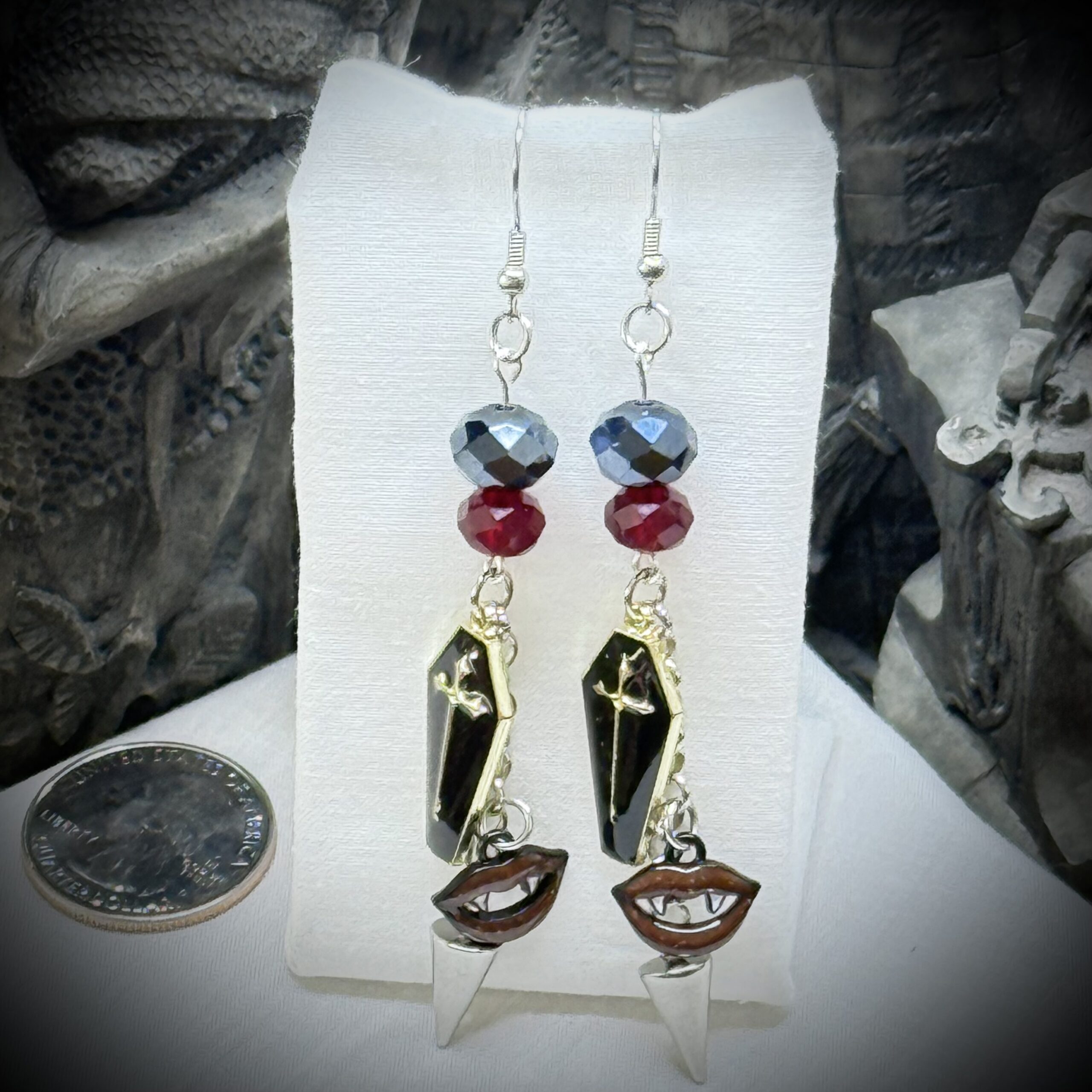 Darkly romantic, imbued with a touch of the gothic, these tributes to the Slayer's world whisper of moonlit nights and battles fought in the shadows. Black caskets, small and ornate, add to the morbid charm, perhaps holding secrets or symbolizing eternal rest (or unrest). Small, silver spikes, dangle menacingly. From each spike swings a tiny, exquisitely detailed vampire fangs, a reminder of the creatures that lurk in the night. Finally, splashes of crimson and onyx – red and black glass beads – punctuate the design, echoing the colors of blood and darkness, the eternal struggle between good and evil. These are more than just accessories; they're a statement. They're a whisper of "Grr. Argh." and a nod to the Slayer who kept Sunnydale safe.