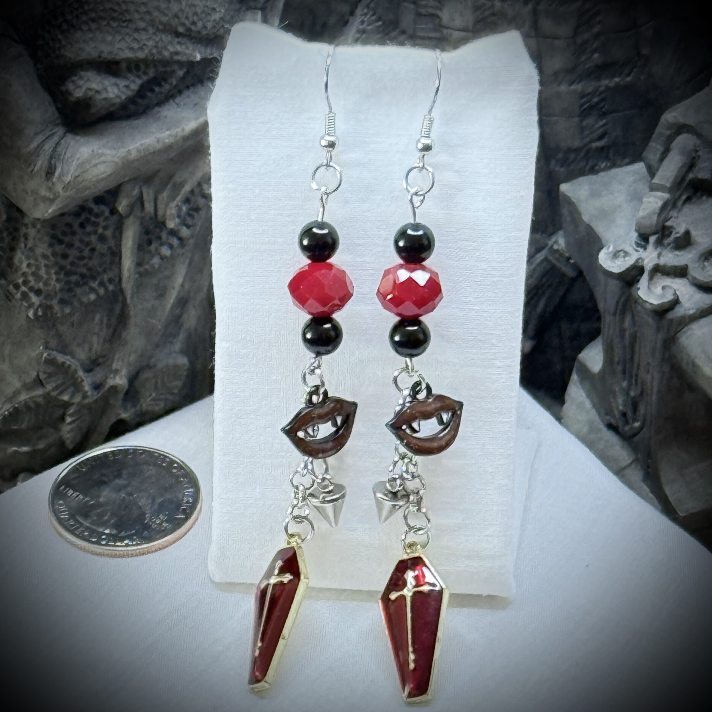 Darkly romantic, imbued with a touch of the gothic, these tributes to the Slayer's world whisper of moonlit nights and battles fought in the shadows. From tiny, exquisitely menacing vampire fangs dangle small, silver spikes. From each spike swings a reminder of the creatures that lurk in the night; red caskets, small and ornate, add to the morbid charm, perhaps holding secrets or symbolizing eternal rest (or unrest). Finally, splashes of crimson and onyx – red and black glass beads – punctuate the design, echoing the colors of blood and darkness, the eternal struggle between good and evil. These are more than just accessories; they're a statement. They're a whisper of "Grr. Argh." and a nod to the Slayer who kept Sunnydale safe.