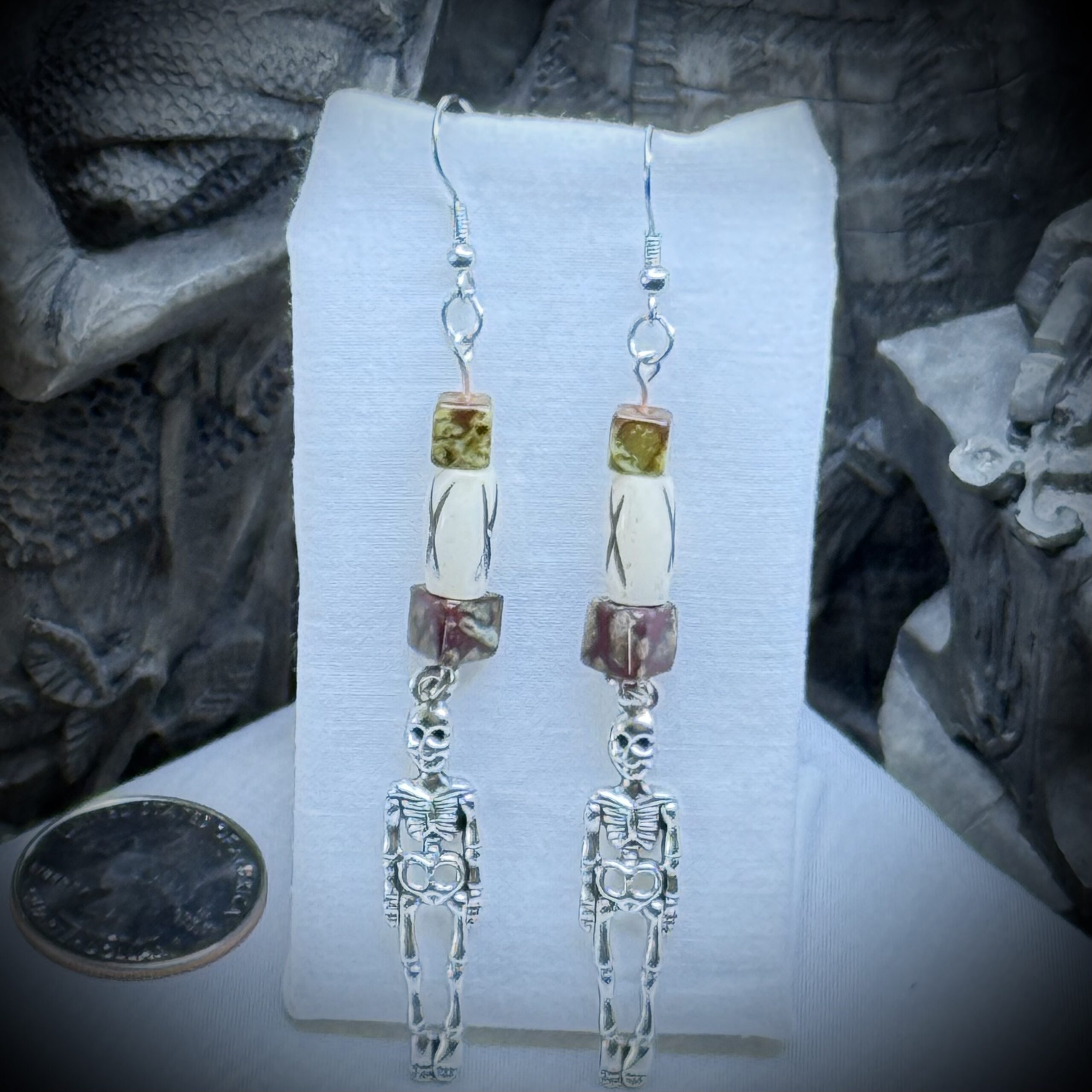 Adorn yourself with the chilling elegance of these gothic earrings. Silvered skeletons, delicate yet macabre, dangle with an eerie grace from bone and ceramic beads, a haunting symphony of the morbid and the beautiful. These skeletal adornments whisper tales of the underworld, a chilling reminder of mortality and a darkly captivating addition to your gothic style.