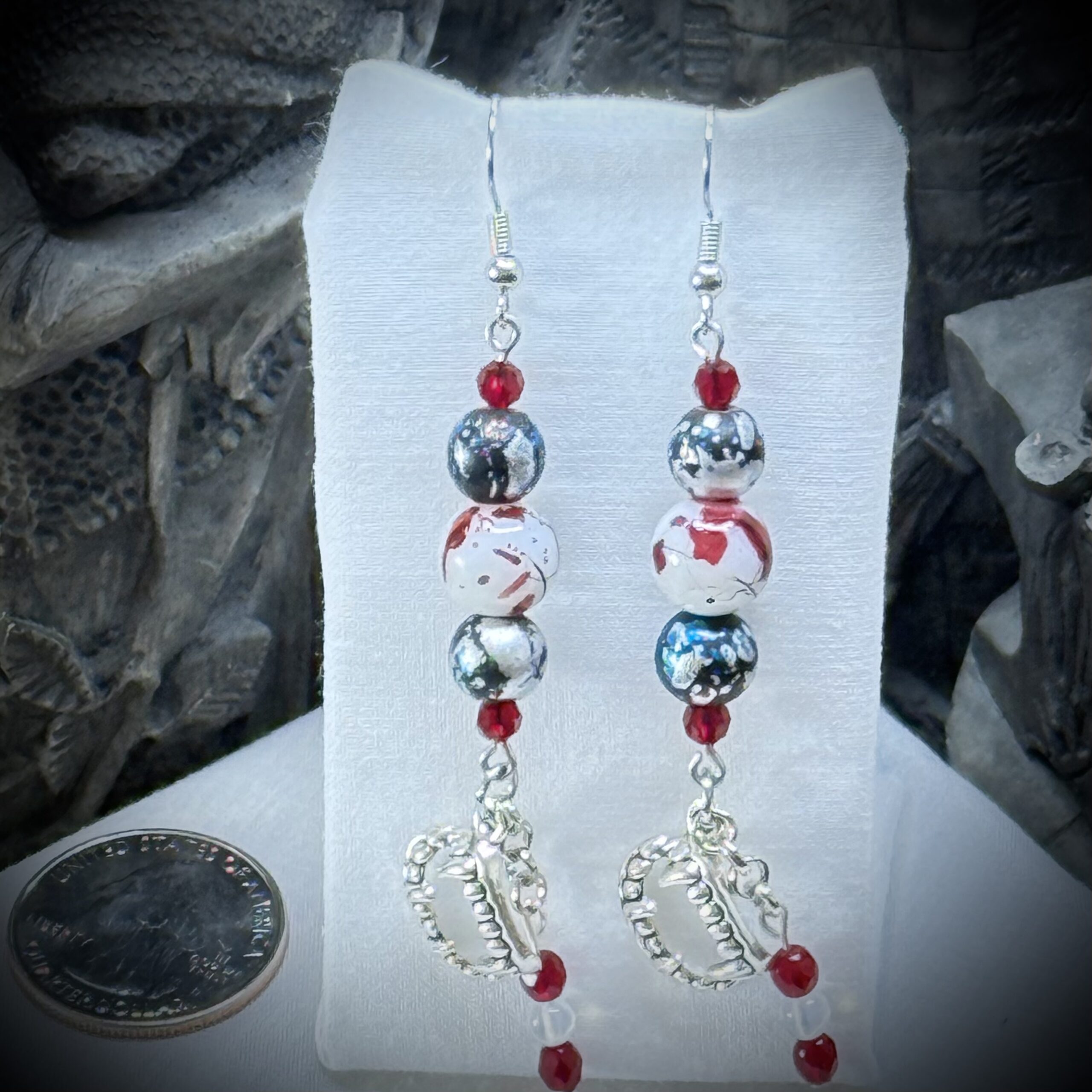 Embrace the allure of the night with these captivating vampire teeth earrings, where darkly romantic elegance meets gothic mystique. Intricately crafted fangs, gleaming with an otherworldly sheen, dangle seductively, each dangled with mesmerizing droplets of crimson, as if freshly quenched by a vampiric kiss. Blood-splatter beads, like captured moments of a forbidden feast, intertwine with delicate glass beads above, creating a symphony of shadows and light that will enchant and enthrall all who dare to gaze upon them.