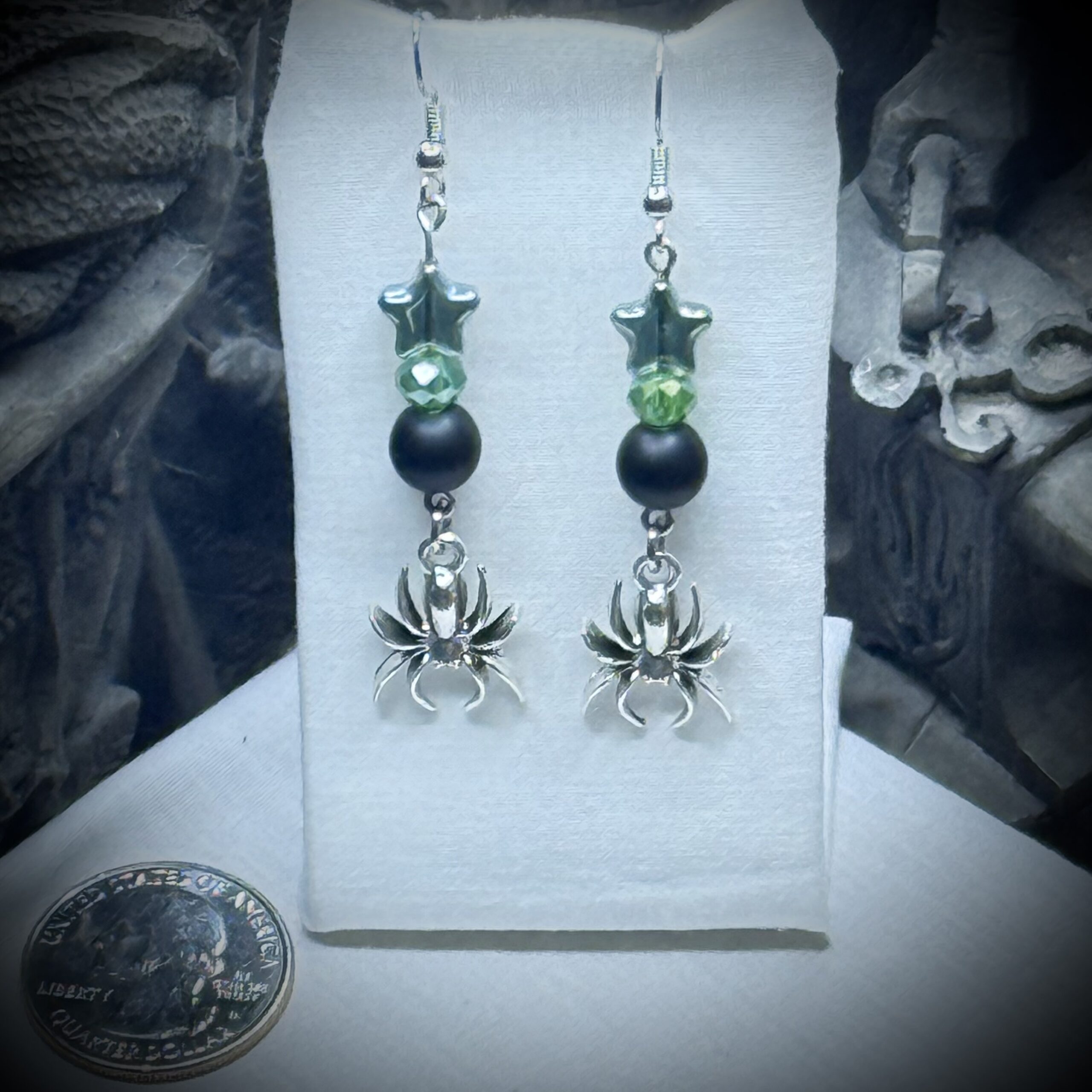 Embrace the shadows with these bewitching earrings, a whispered secret from the depths of the night. Black as a moonless sky, green glass stars shimmer with an eerie luminescence, mirroring the cold gleam of distant galaxies. Verdant green crystal beads, like drops of potent nightshade venom, cascade downwards, leading to a darkly captivating spider charm, poised as if ready to deliver a venomous bite. These earrings are a tribute to the witching hour, a subtle yet powerful declaration of your connection to the mystical and the macabre – a reminder that even the most beautiful things can hold a touch of poison, a nightshade bite of gothic allure.