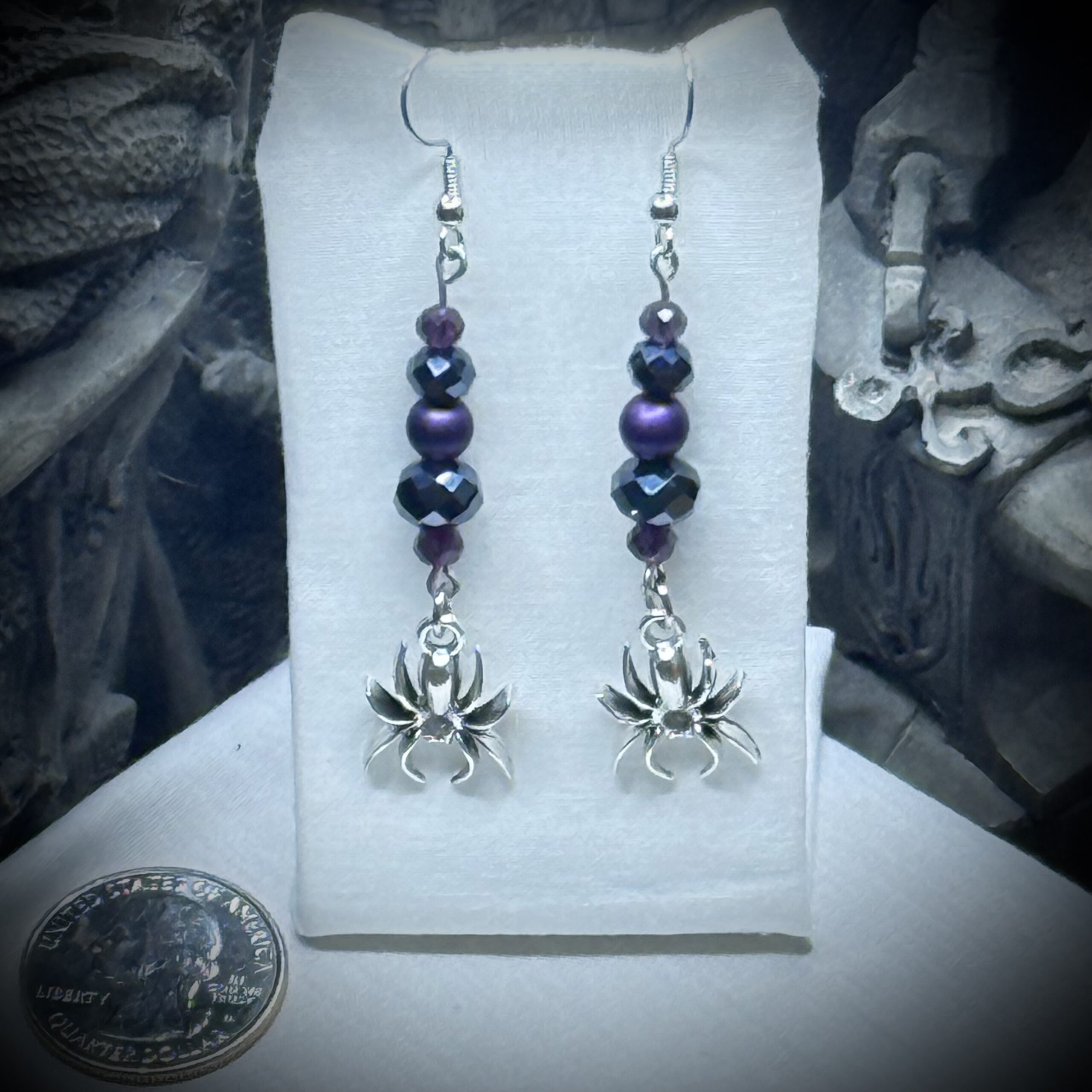 Embrace the mystique of the violet nocturne with these bewitching earrings. Deep black and dark purple beads, like shadows dancing in the moonlight, cascade down to cradle a delicate spider charm. These weaver earrings capture the essence of gothic romance and witchy allure, a subtle yet powerful reminder of the magic that weaves through the darkness. Perfect for adding a touch of nocturnal elegance to any ensemble.