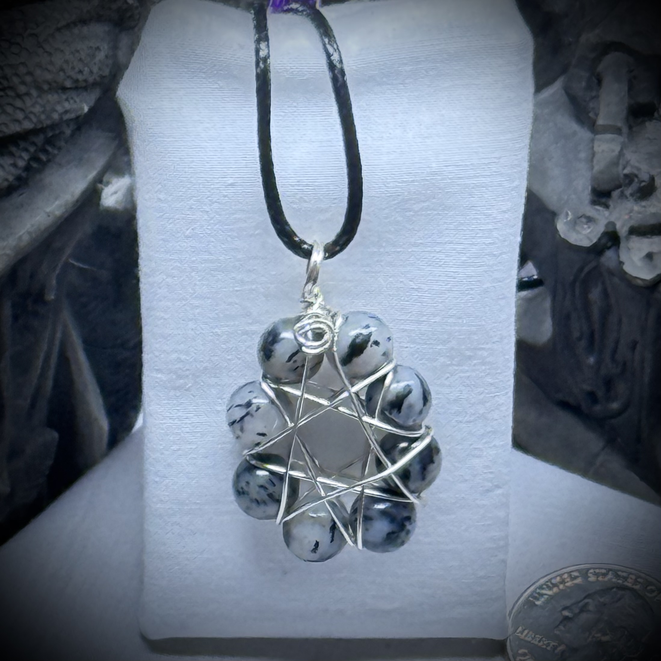 A large, brindle agate stone, swirling with earthy tones, is the focal point of this handcrafted necklace. Delicate wire wrapping, reminiscent of elven craftsmanship, spirals around the stone, forming an intricate, star-like design. This piece is imbued with a touch of magic, a talisman of grounding, balance, protection, and natural enchantment.They come on a waxed cord with a clasp.
