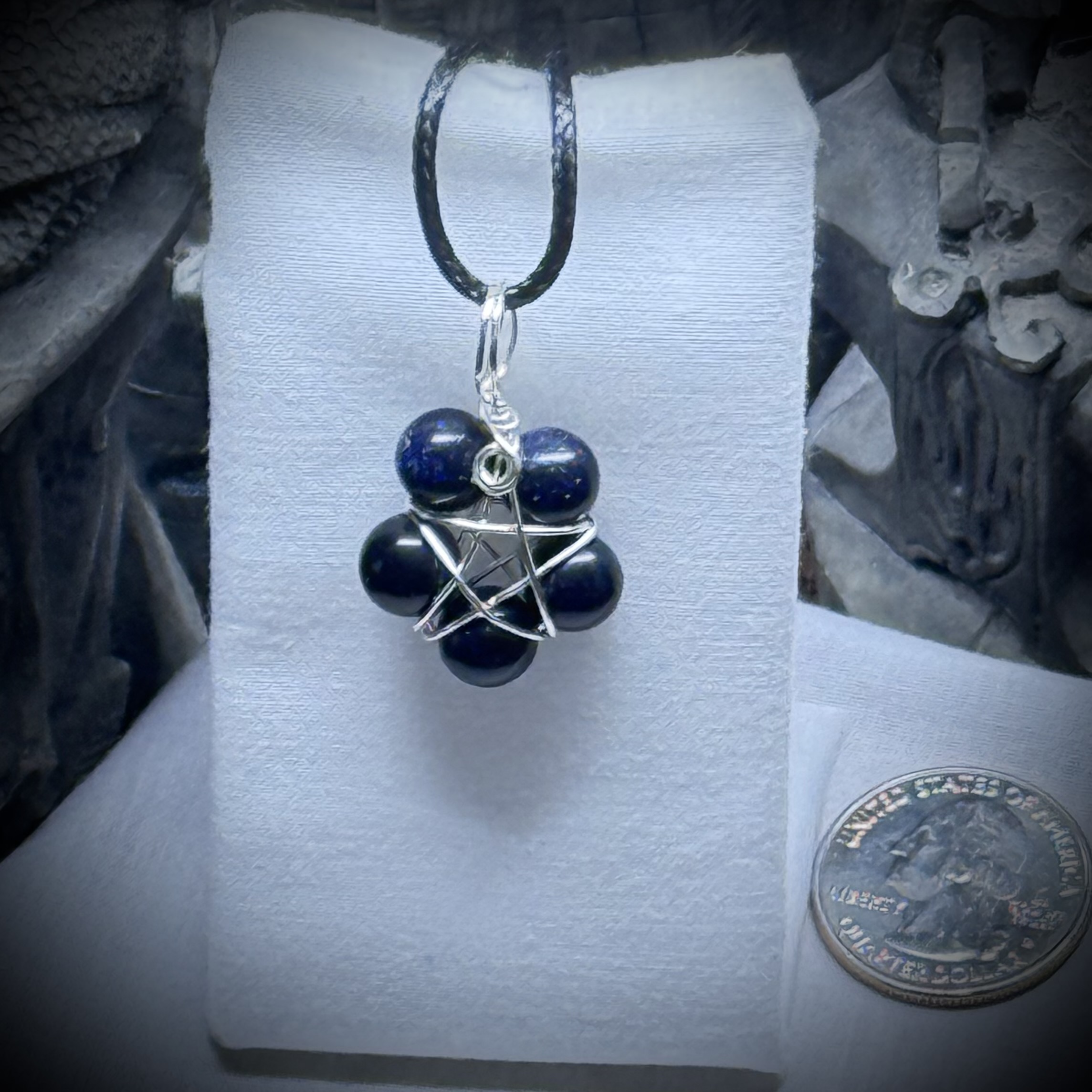 A hand-crafted pentacle, formed from shimmering blue goldstone, is delicately wrapped with fine silver wire. The deep blue of the stone, speckled with glittering inclusions, evokes a starlit night sky. The wirework, simple yet elegant, secures the stone while allowing its natural beauty to shine. This piece is imbued with a sense of magic, a tangible connection to celestial energies.They come on a waxed cord with a clasp.