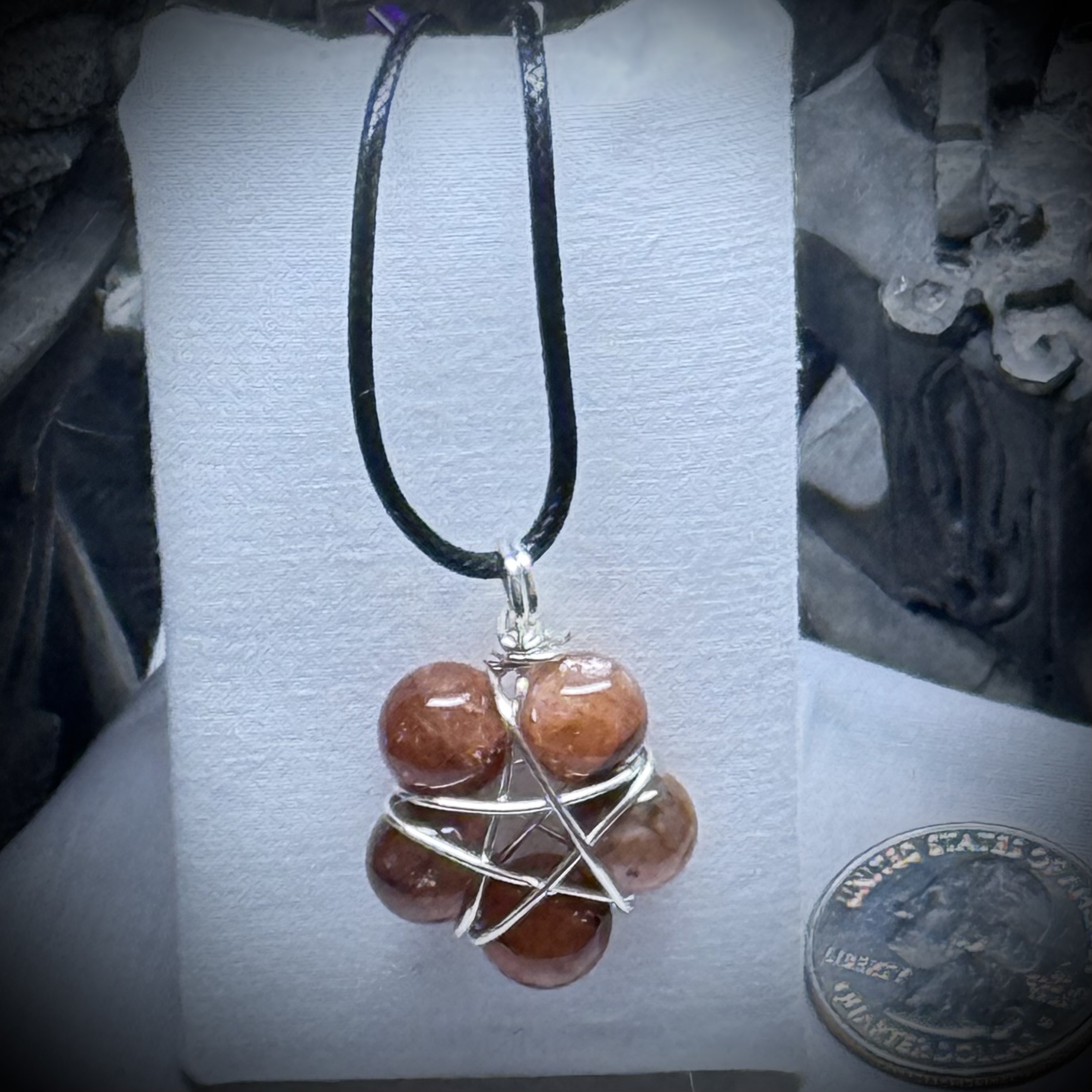 A hand-crafted sunstone pentacle, lovingly wire-wrapped. The warm, radiant sunstone, known for its joyful energy, is carefully secured within a delicate frame of woven wire, forming a powerful pentacle symbol. This piece is imbued with intention, a magical talisman designed to bring light, vitality, and protection to its wearer.They come on a waxed cord with a clasp.