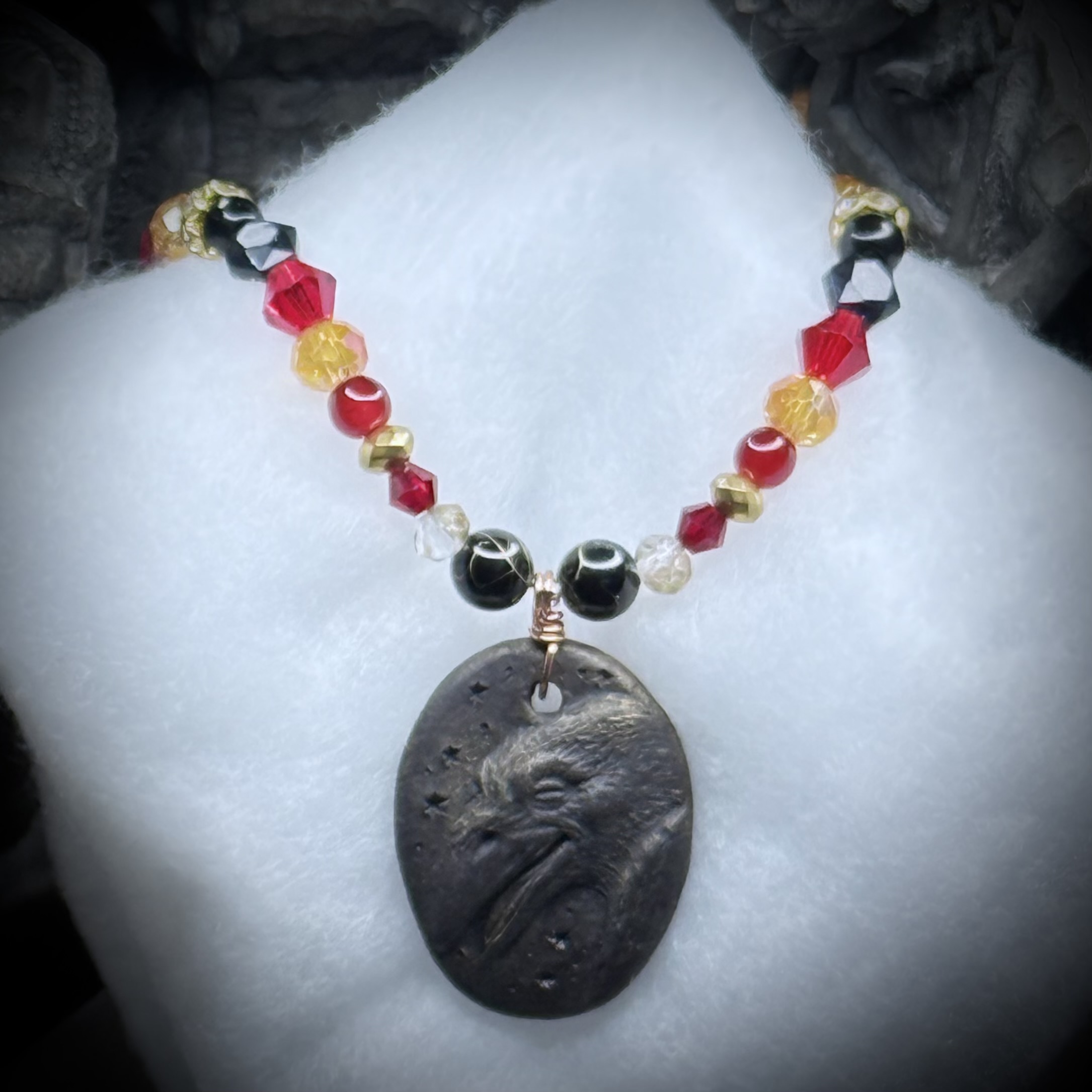 Invoke the wisdom of the raven with this striking necklace. A handcrafted, locally made ceramic pendant depicting a sleek joyful black raven takes center stage, embodying mystery and transformation. Flanking this powerful symbol are strands of shimmering blue goldstone, reminiscent of a starlit night, interspersed with the faceted brilliance of Czech crystaland glass beads. This piece blends celestial sparkle with earthly mystique, creating a captivating accessory that resonates with both inner strength and otherworldly charm. All metal used in this piece is Nickel and Lead free. 22" Long