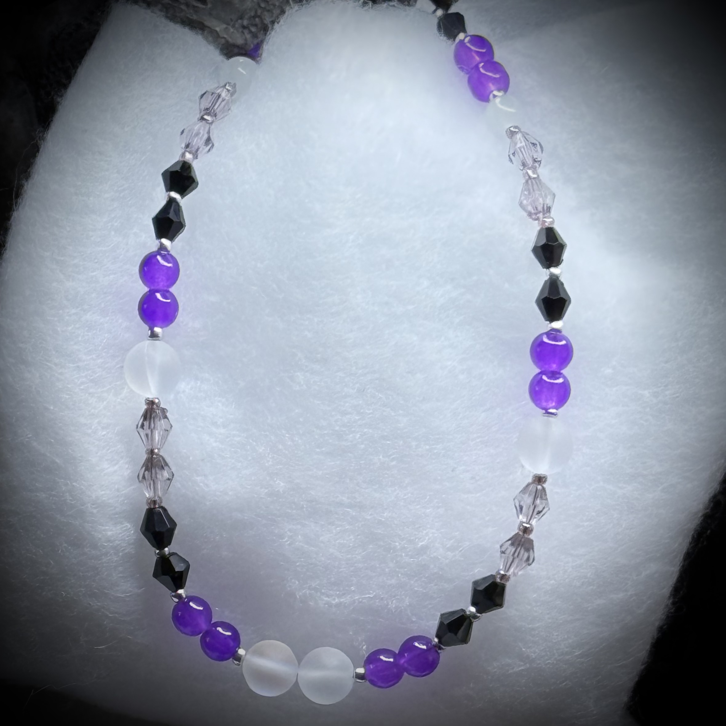 The beads are carefully chosen for their varying shades and textures, creating a visually compelling piece that embodies the strength and diversity of the community. The purple hues symbolize community, while the grey represents the grey-asexual and demisexual spectrums. Black signifies asexuality, and white represents allies and non-asexual partners. Each necklace is a wearable symbol of pride and visibility, designed to be both a personal expression and a conversation starter.