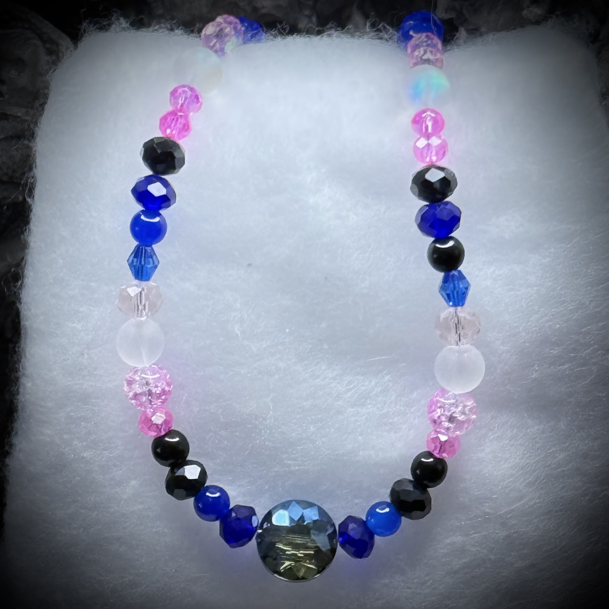 These handcrafted necklaces are a vibrant tribute to the genderfluid community, crafted with shimmering blue, purple, pink, black, and white glass beads. Each bead is carefully selected and strung together to create a unique and eye-catching design. The necklaces are not only beautiful but also a powerful symbol of fluidity, self-expression, and pride.