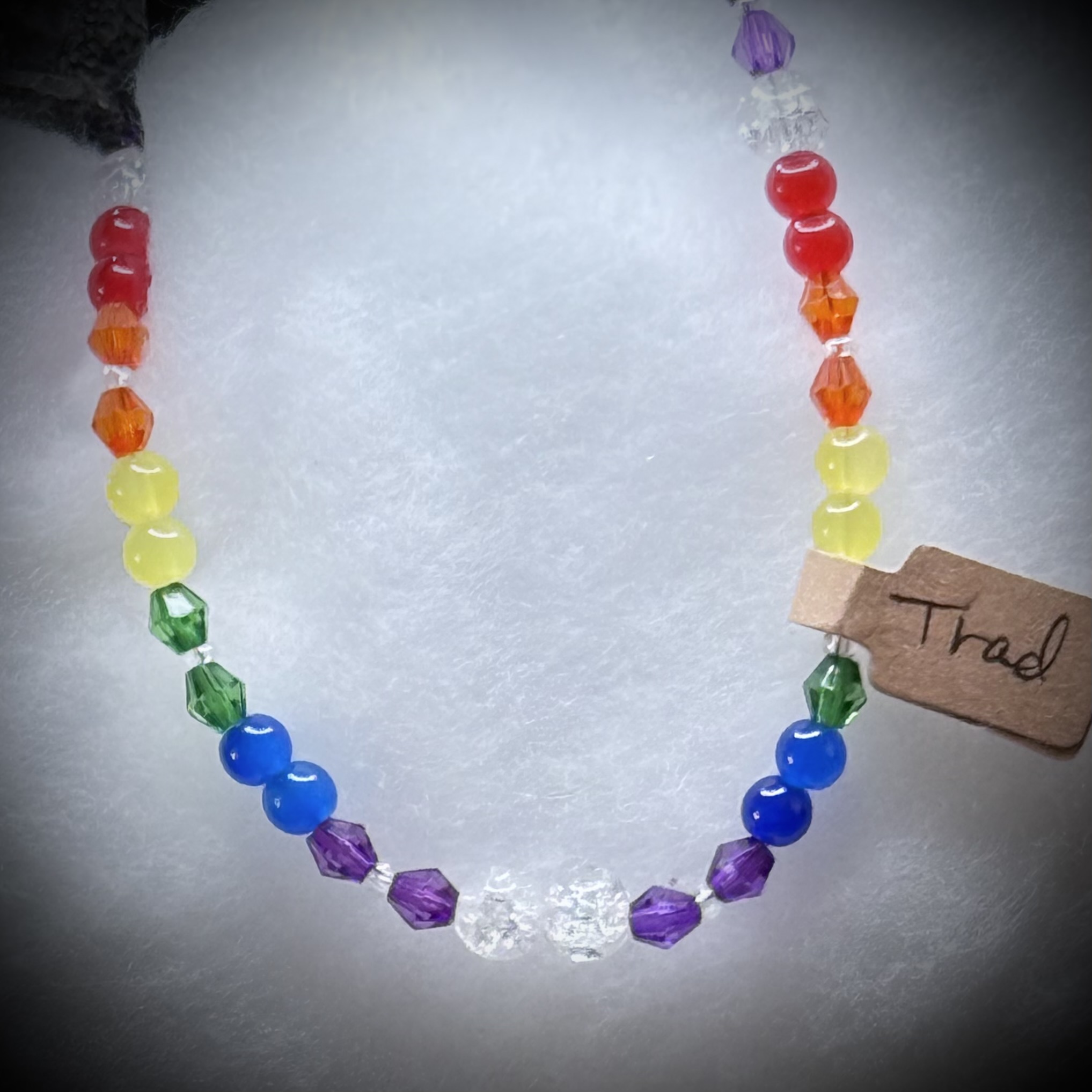 These vibrant necklaces celebrate the spectrum of the LGBTQ+ community, showcasing the iconic rainbow pride flag colors in a wearable form. Each necklace is strung with carefully selected beads, capturing the essence of red, orange, yellow, green, blue, and violet. The beads may vary in size and texture, offering a unique and personal touch, whether crafted from glass, wood, or other materials. These necklaces serve as a visible symbol of solidarity, love, and acceptance, allowing individuals to express their pride and support for the LGBTQ+ community. They are a powerful reminder of the beauty and diversity within the rainbow.