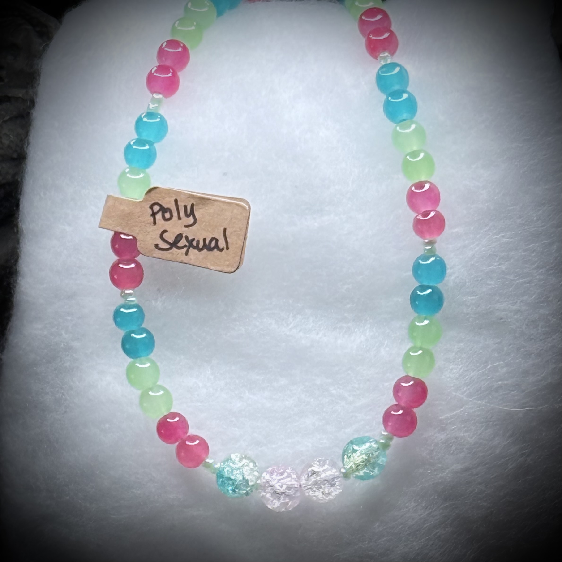 These vibrant necklaces are a celebration of polysexual pride, bursting with the colors of the polysexual flag: bright blue, pink, green, and white. Each necklace is handcrafted with high-quality glass beads, carefully selected and strung together to create a unique and eye-catching design. They are not only beautiful but also a powerful symbol of love, acceptance, and the diversity of human attraction.