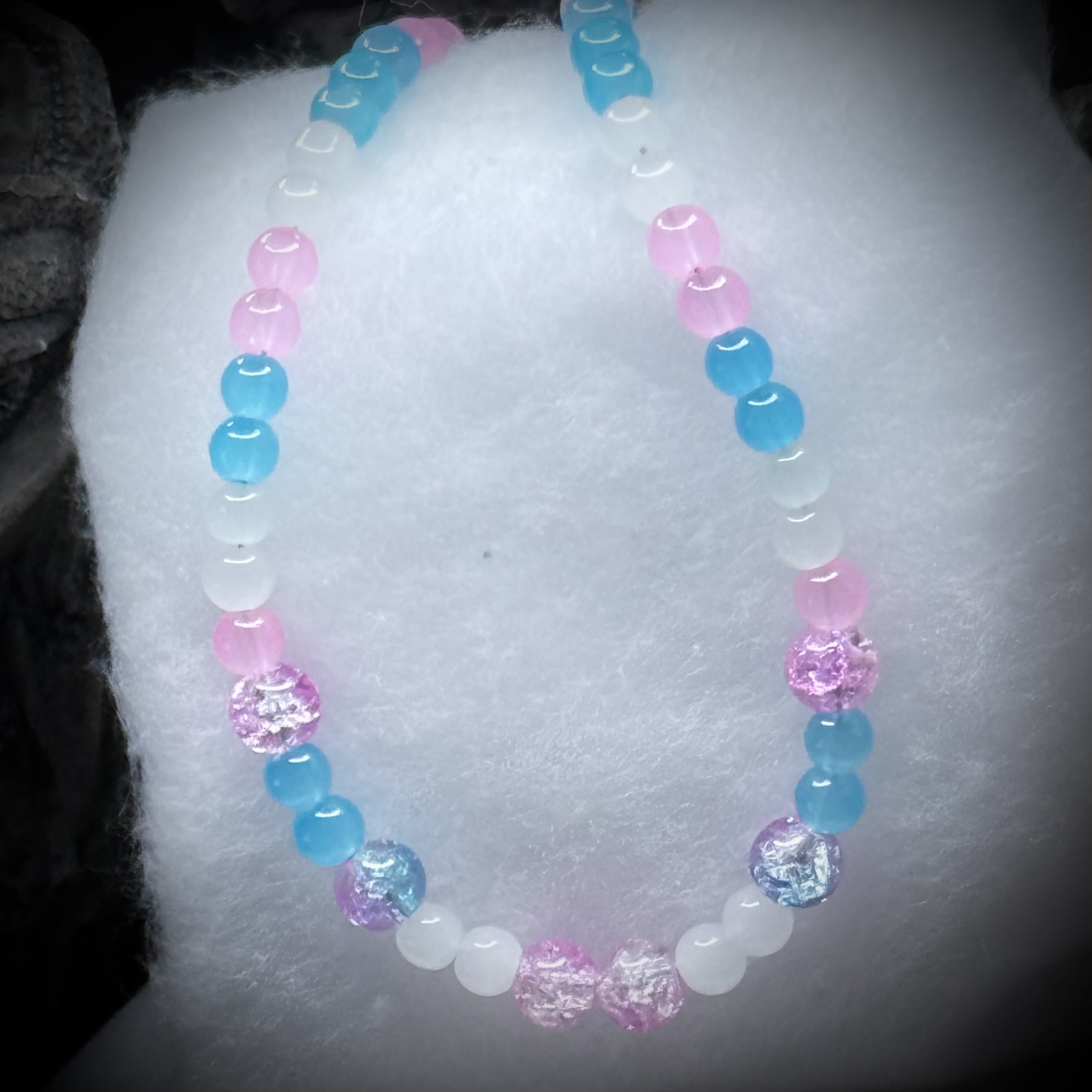 These handcrafted necklaces are a vibrant tribute to the transgender community, crafted with shimmering light blue, light pink, and white glass beads. Each bead is carefully selected and strung together to create a unique and eye-catching design. The necklaces are not only beautiful but also a powerful symbol of pride, resilience, and self-acceptance.