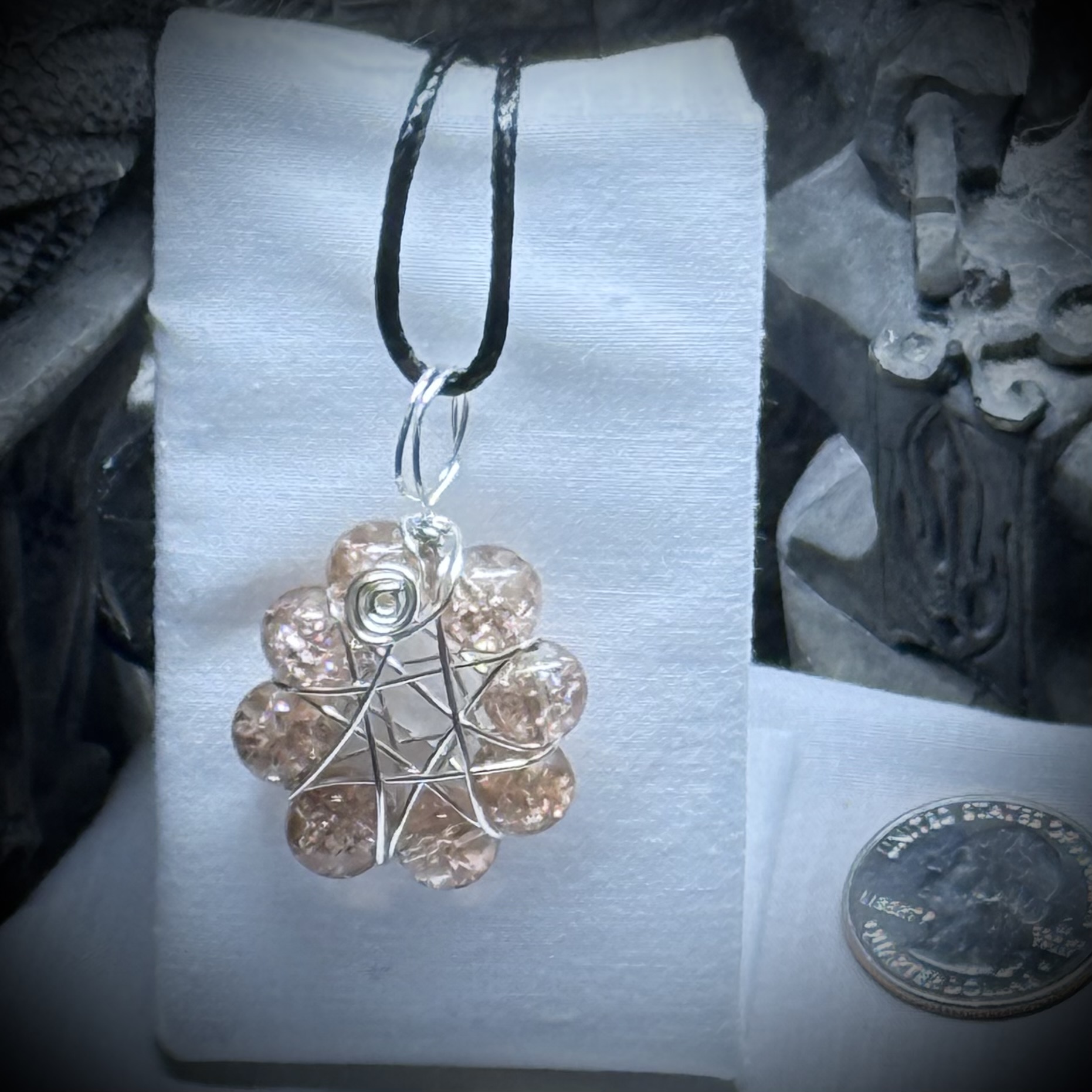 A delicate, hand-crafted wire-wrapped pendant, featuring the seven points of an elven star formed from slender, twisting wire. Copper crackle glass beads, shimmering like captured starlight, are nestled within the wire framework, catching and reflecting light with a subtle, magical glow. This piece evokes a sense of ancient enchantment and ethereal grace. They come on a waxed cord with a clasp.