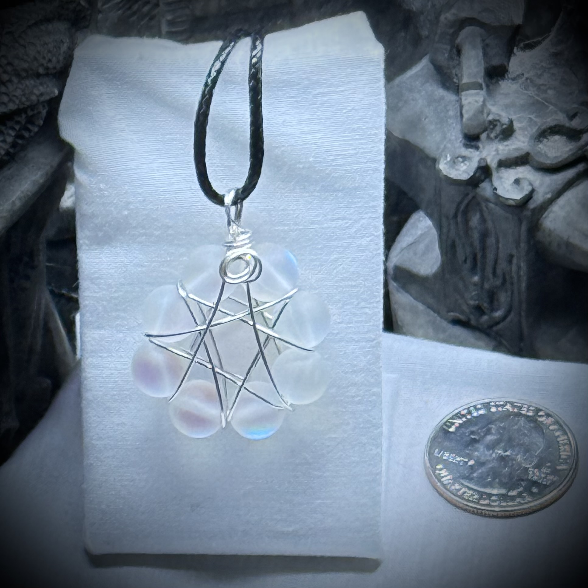 A delicate, hand-crafted wire-wrapped pendant, featuring the seven points of an elven star formed from slender, twisting wire. Glowing Aura glass beads are nestled within the wire framework, catching and reflecting light with a subtle, magical glow. This piece evokes a sense of ancient enchantment and ethereal grace. They come on a waxed cord with a clasp.