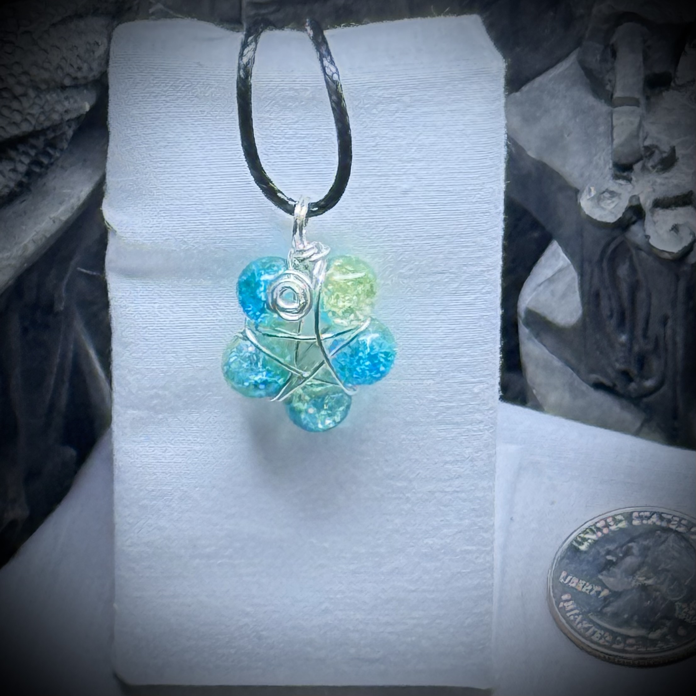 A hand-crafted pentacle, formed from delicate, interwoven wire, holds representation of Water energy – BlueGreen glass beads at each of its five points. The wire, carefully shaped and wrapped, creates a sturdy yet elegant frame, while the glass beads catch and reflect light, adding a touch of mystical sparkle. This piece is imbued with intention, a tangible symbol of protection and connection to the elements. They come on a waxed cord with a clasp.