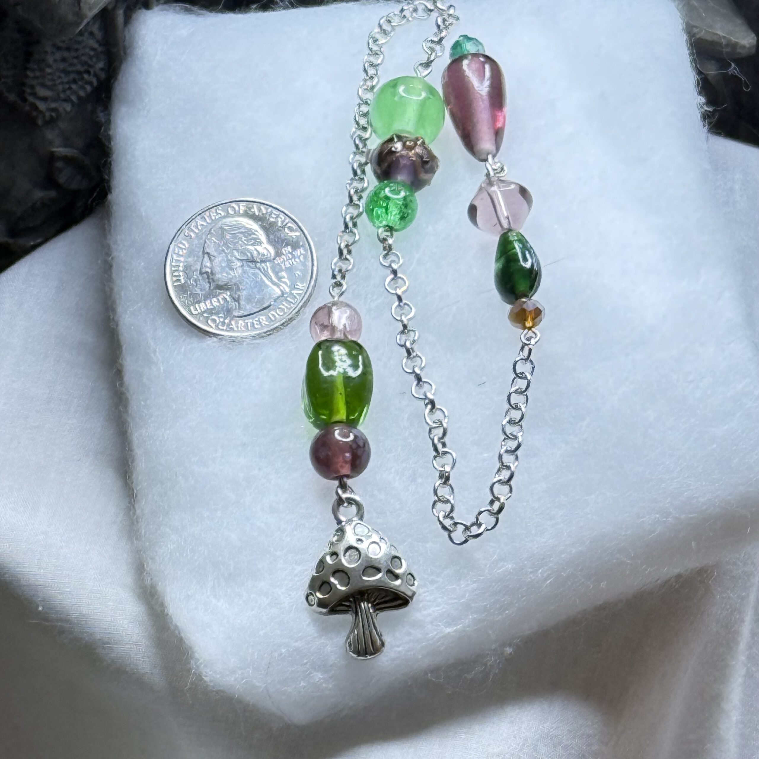 This enchanting pendulum, meticulously crafted from green and purple glass beads, with a mushroom, is a tool for divination and spiritual exploration. Its smooth, polished surface reflects light beautifully, making it both visually appealing and easy to use. Whether you're seeking answers to life's questions, connecting with your intuition, or exploring the subtle energies around you, this hand-crafted pendulum is a valuable tool for your journey of self-discovery.