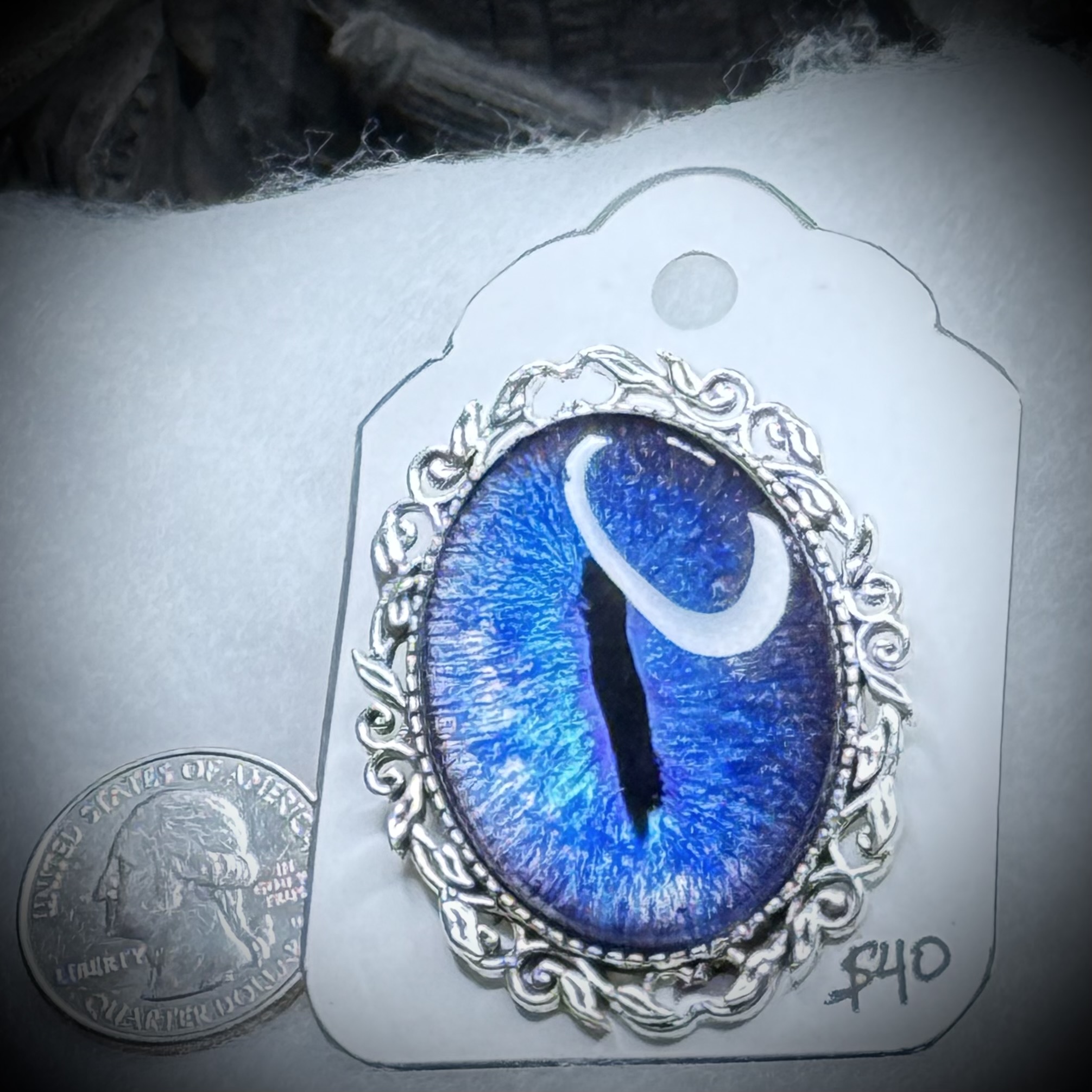 Within the intricate embrace of a large, antique-inspired filigree brooch, a hand-painted dragon eye in Blue, silvery and hints of purple hues burns with an inner light. This is no ordinary ornament; it is a conduit of magic. The eye, rendered with meticulous detail, seems to follow your gaze, its vibrant hues shifting with the light. The filigree, a delicate web of metal, enhances the eye's mystical presence, making this brooch a striking statement of otherworldly allure.