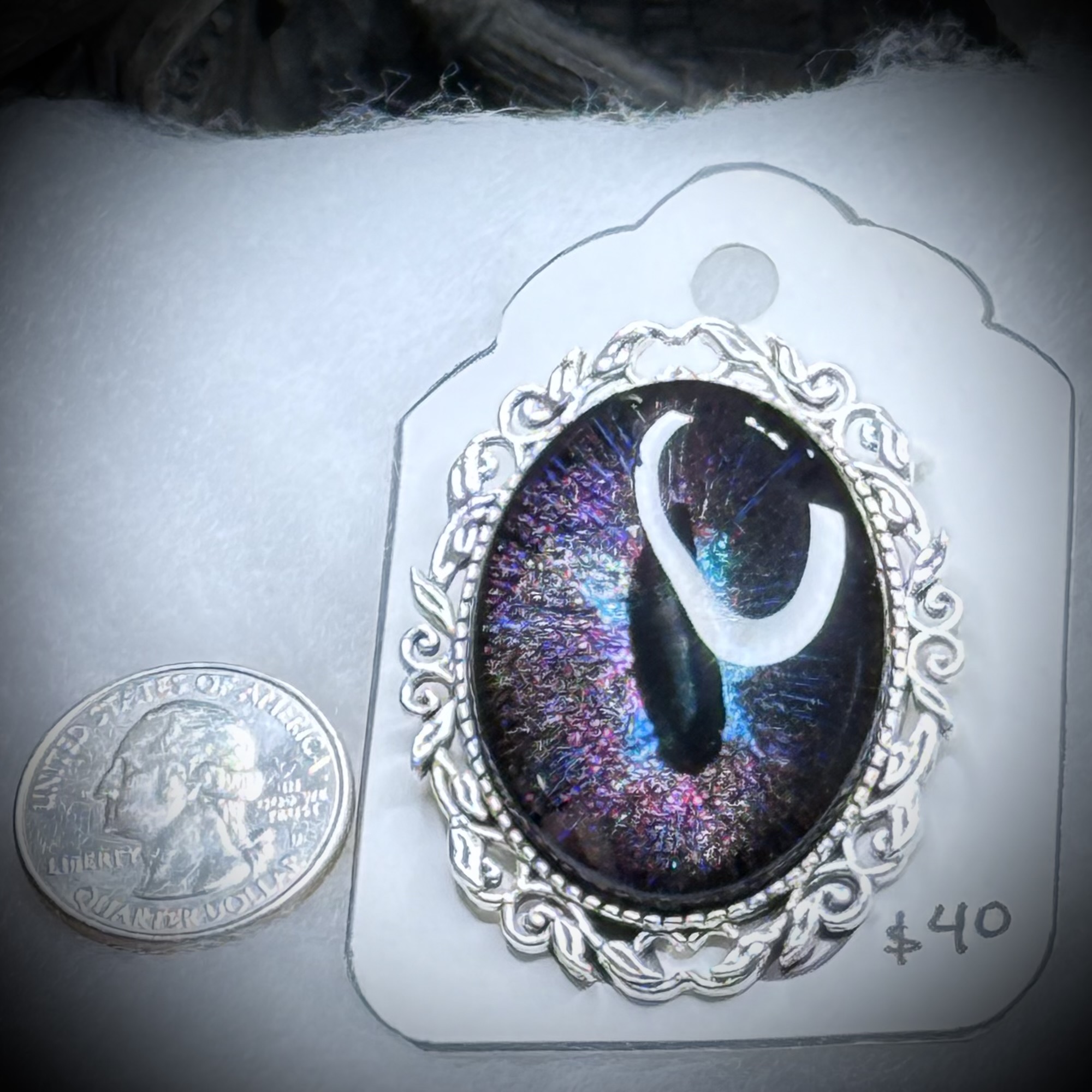 Within the intricate embrace of a large, antique-inspired filigree brooch, a hand-painted dragon eye in deep purple, blue and hints of glittery black tones are reminiscent of deep space. This is no ordinary ornament; it is a conduit of magic. The eye, rendered with meticulous detail, seems to follow your gaze, its vibrant hues shifting with the light. The filigree, a delicate web of metal, enhances the eye's mystical presence, making this brooch a striking statement of otherworldly allure.