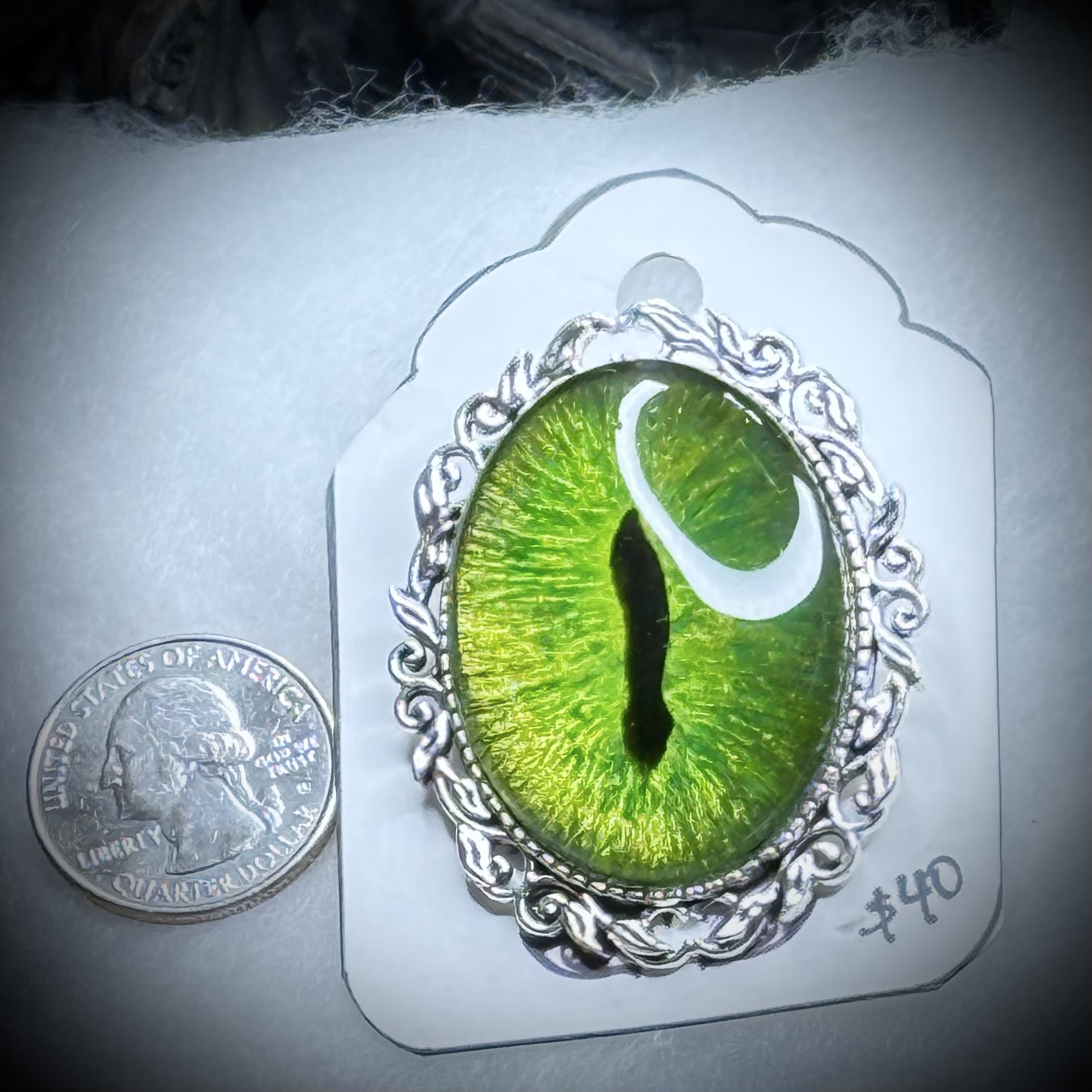 Within the intricate embrace of a large, antique-inspired filigree brooch, a hand-painted dragon eye in light spring greens that are mystical like a serpents gaze. This is no ordinary ornament; it is a conduit of magic. The eye, rendered with meticulous detail, seems to follow your gaze, its vibrant hues shifting with the light. The filigree, a delicate web of metal, enhances the eye's mystical presence, making this brooch a striking statement of otherworldly allure.