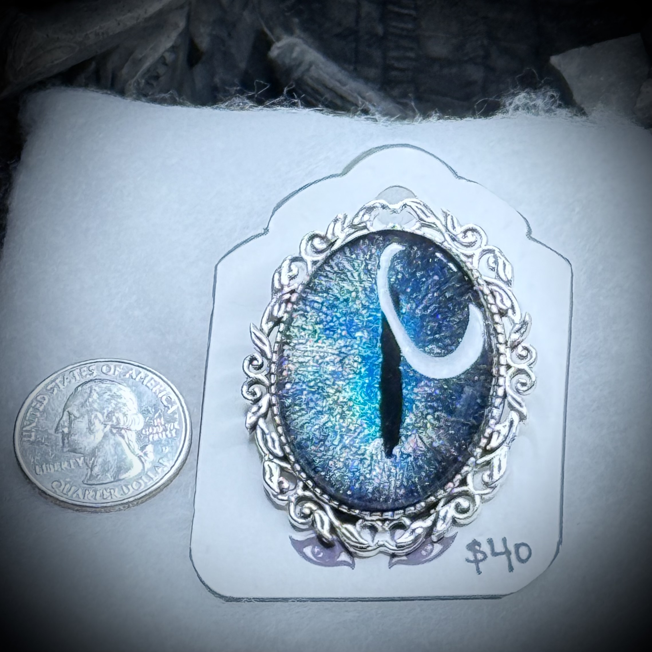 Within the intricate embrace of a large, antique-inspired filigree brooch, a hand-painted dragon eye in teal and glittering gun metal hides in the shadows with a spark of light. This is no ordinary ornament; it is a conduit of magic. The eye, rendered with meticulous detail, seems to follow your gaze, its vibrant hues shifting with the light. The filigree, a delicate web of metal, enhances the eye's mystical presence, making this brooch a striking statement of otherworldly allure.