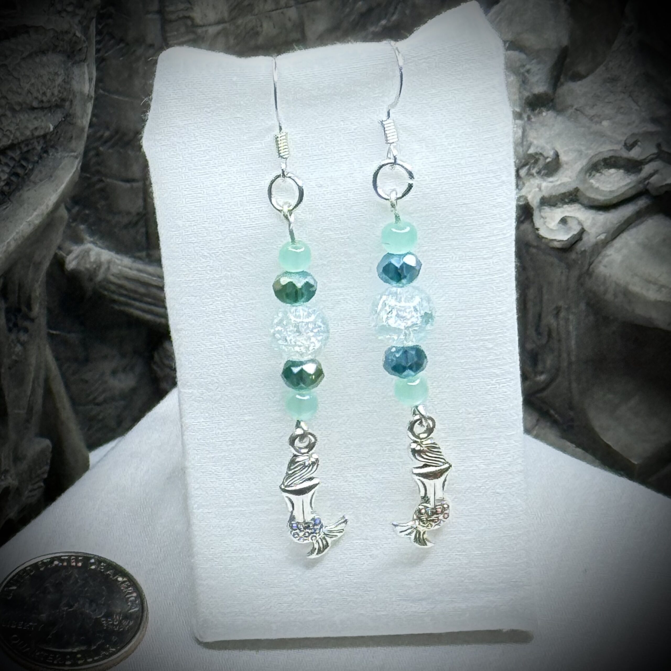 Whispers of the ocean's song, captured in delicate mermaid form and glass beads of light green and blue green. These Spring Waters earrings evoke the tranquility and beauty of a spring tide, a reminder of the magic that lies beneath the surface.