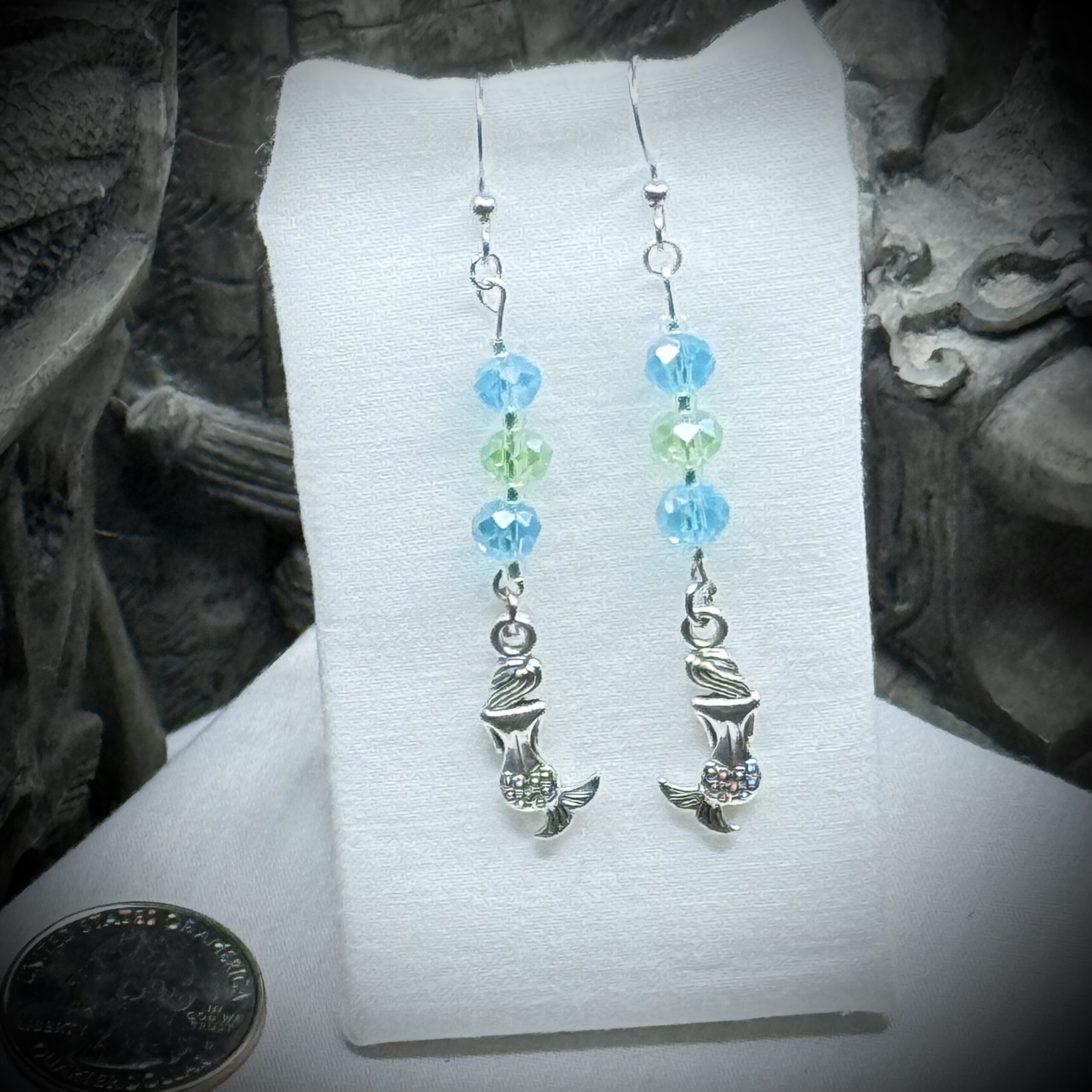 Unleash the magic of the deep with these enchanting Mermaid earrings. Inspired by the pristine beauty of the sea, these treasures capture the allure of mythical mermaids and the shimmering secrets they hold. Let the Sea Magic wash over you with the glass crystal beads of blue and green