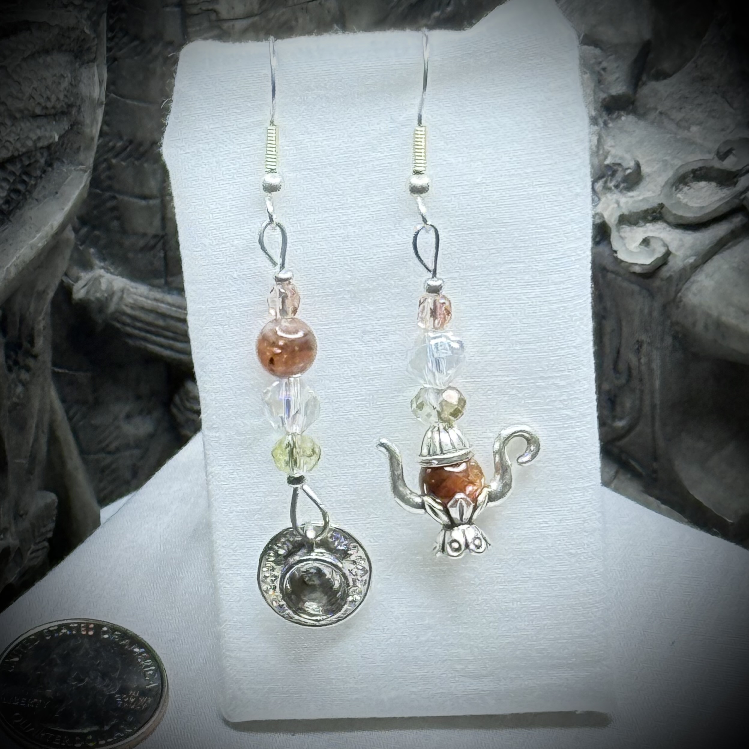These Vitali-tea Spot of Tea earrings of tea pot and tea cup have energy enhancing Oregon Sunstone beads . They are perfect for tea lovers, or those you know who love tea!