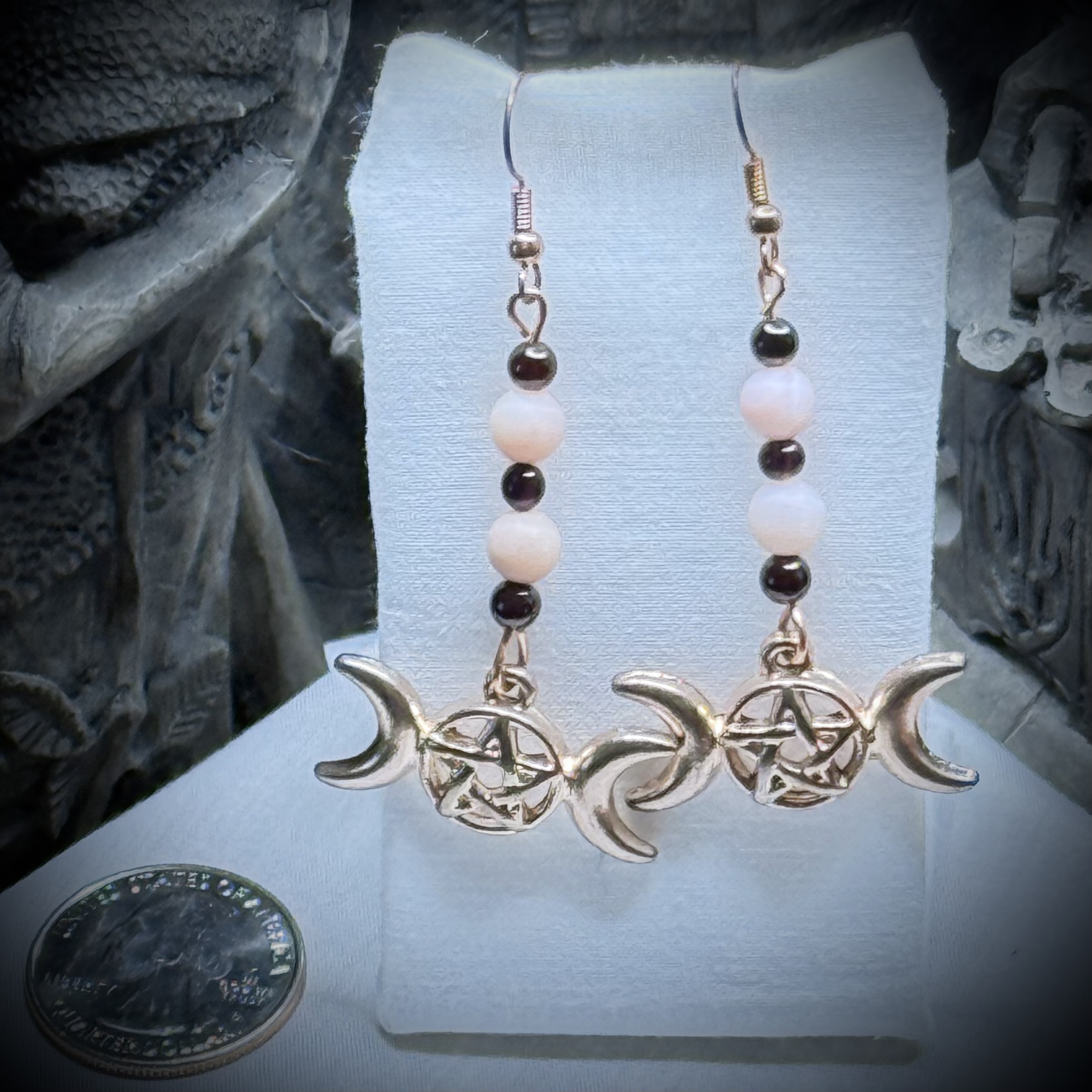 Discover the magic of genuine gemstones with our Triple Goddess Balance earrings. Crafted with authentic gemstones, these earrings feature a symbolic design that embodies harmonious balance. Let the energies of Copper, Garnet, and Pink Peruvian Opal empower you as you embrace the essence of the Triple Goddess. Elevate your style and energy with these exquisite earrings today! The earrings have hypoallergenic french hooks and clear silicon earring backs.