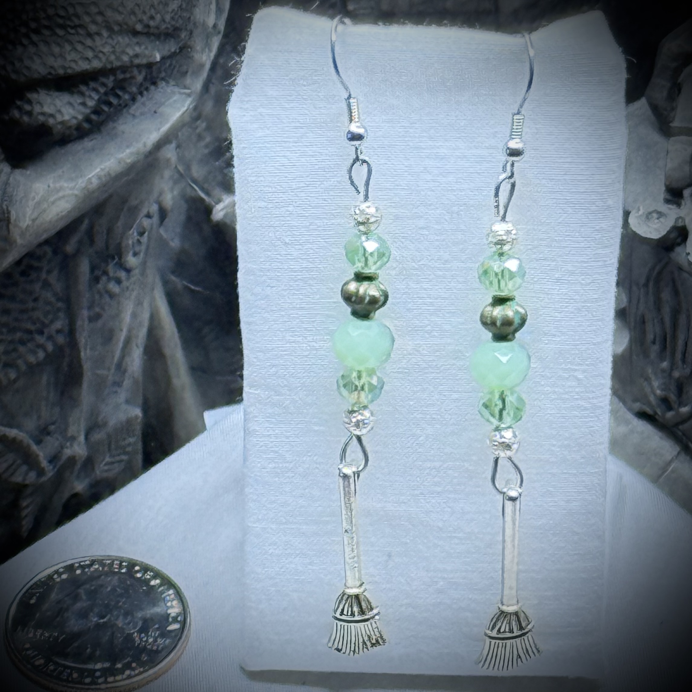 These witchy wonder broom earrings with sage green glass crystal beads will help sweep away all that no longer serves. The earrings have Surgical Stainless Steel French hooks and clear silicon earring backs.