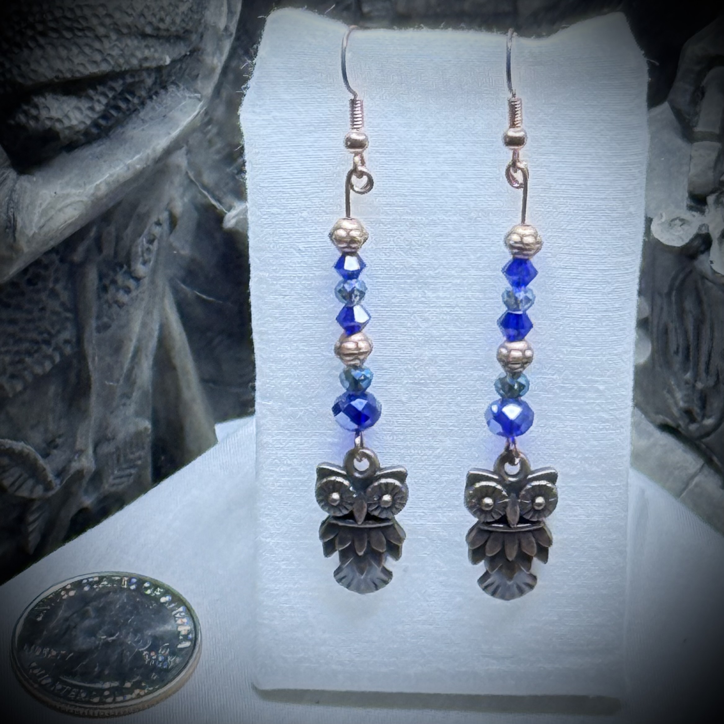 Invoke the wisdom of the night with this enchanting talisman: a copper owl, its gaze both knowing and serene, hangs suspended amidst a cascade of celestial blue and burnished copper beads. Like a creature born of moonbeams and stardust, the owl embodies the magic of twilight, a silent guardian of secrets and a beacon of inner sight. This fantastical adornment whispers of hidden pathways and the quiet power that resides in the heart of the enchanted forest, a touch of otherworldly beauty to guide your journey.