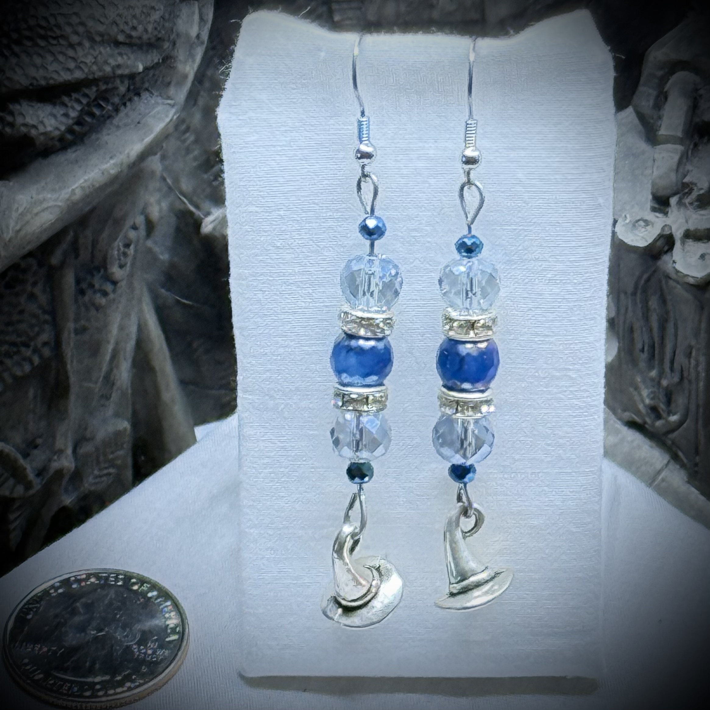 These bewitching earrings capture the essence of a mystical journey, where starlight dances with the whispers of ancient magic. Dazzling blue and crystal-studded silver beads cascade like a celestial waterfall, leading to exquisitely detailed witchy hats that shimmer with an otherworldly allure. Each miniature hat, a testament to fantastical craftsmanship, evokes visions of enchanted forests and moonlit skies, a touch of whimsical wonder to adorn your ears and spark the imagination. The earrings have Surgical Stainless Steel French hooks and clear silicon earring backs.
