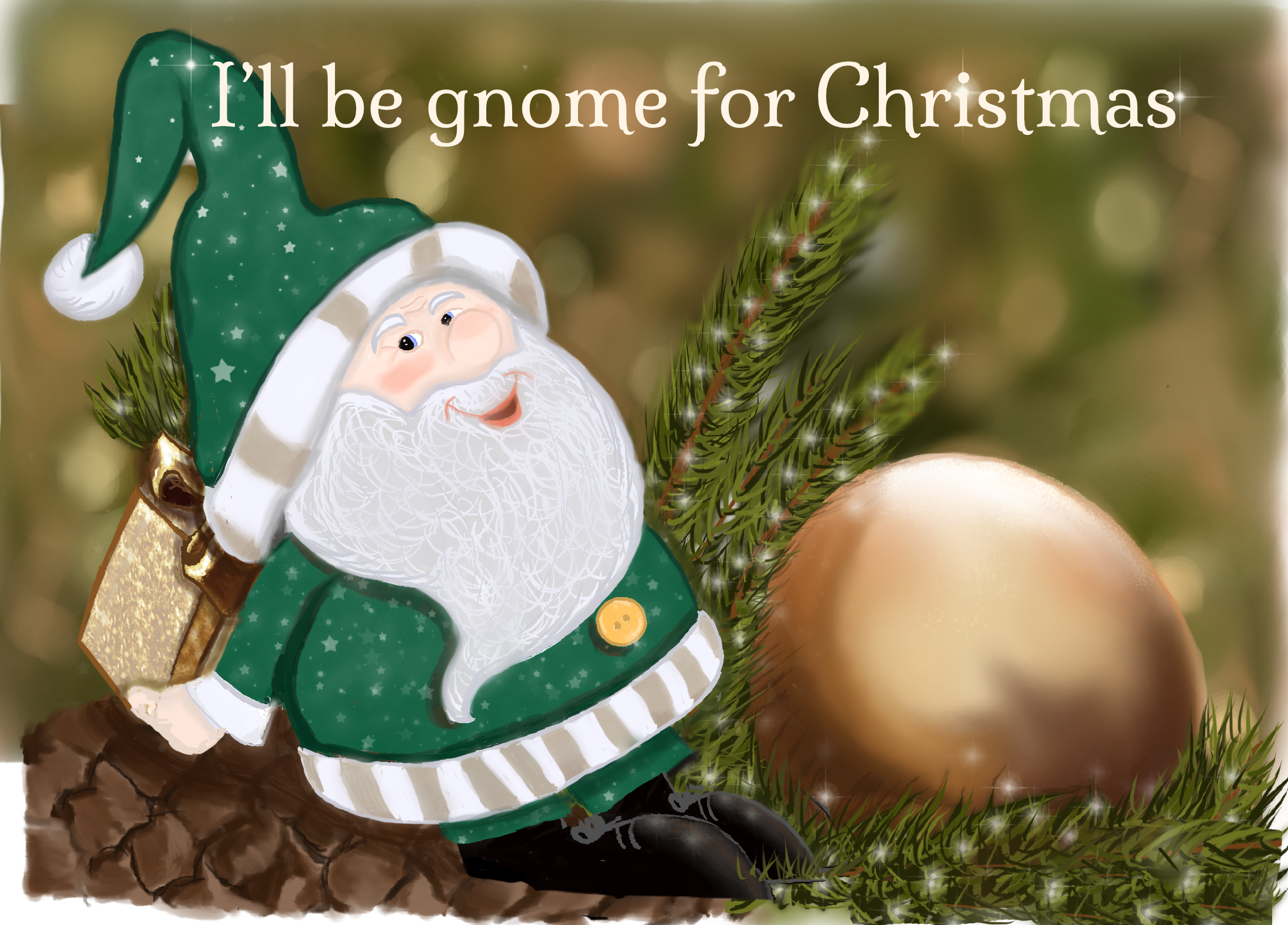 This image created digitally to celebrate the Christmas has a jolly gnome amongst ornaments and on a Christmas Tree. A fun pun of “I’ll be Gnome for Christmas” is on the outside of this card. All cards are blank inside.